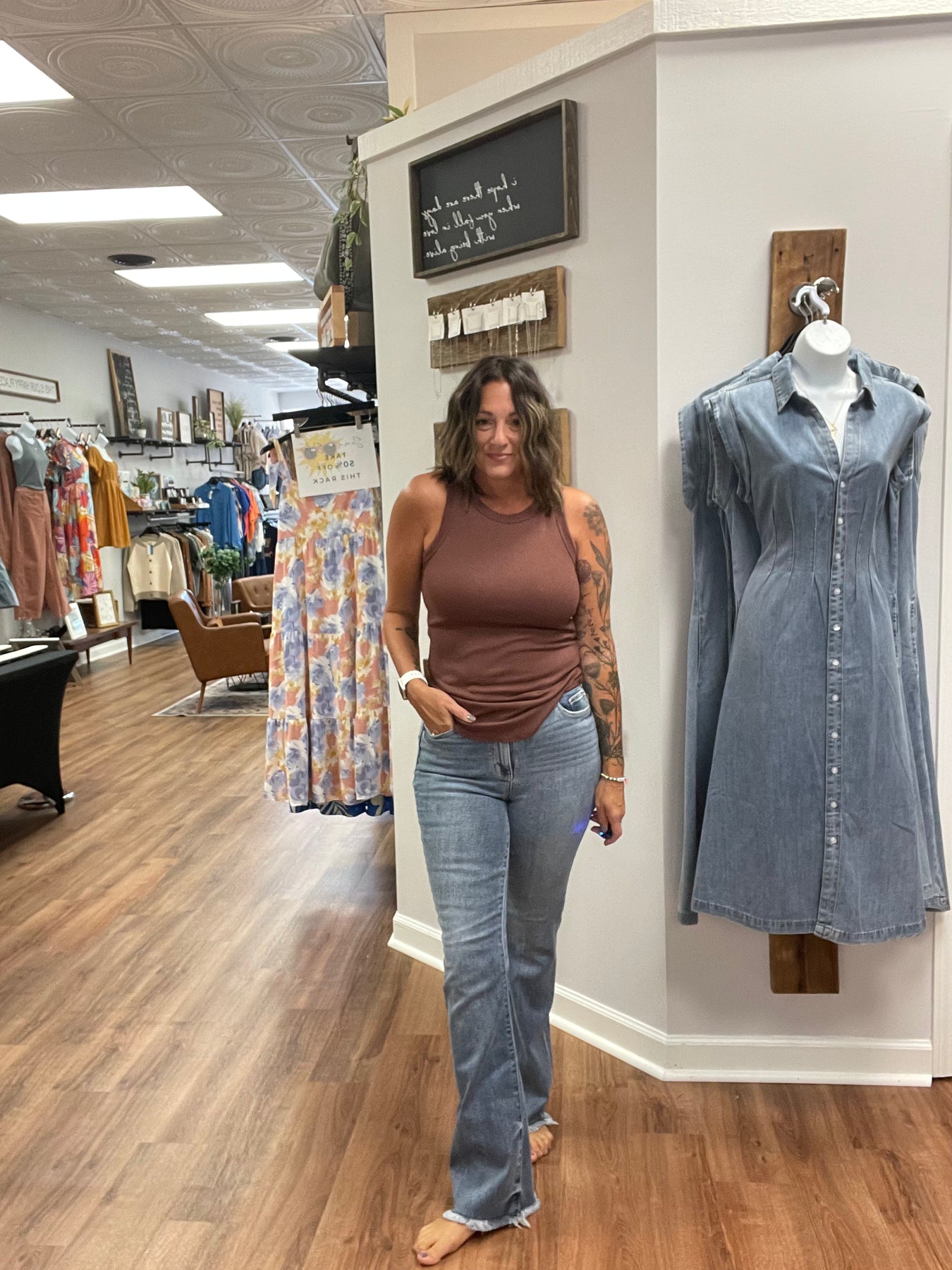 Step into style with our HW Bootcut jeans featuring a trendy fray hem. These jeans hug your waist and flare just right at the bottom, adding a playful twist to your everyday look. The frayed edges bring a casual, cool vibe that's perfect for both lounging and turning heads. Pair them with your favorite kicks or heels and get ready to rock comfort and flair all day long!