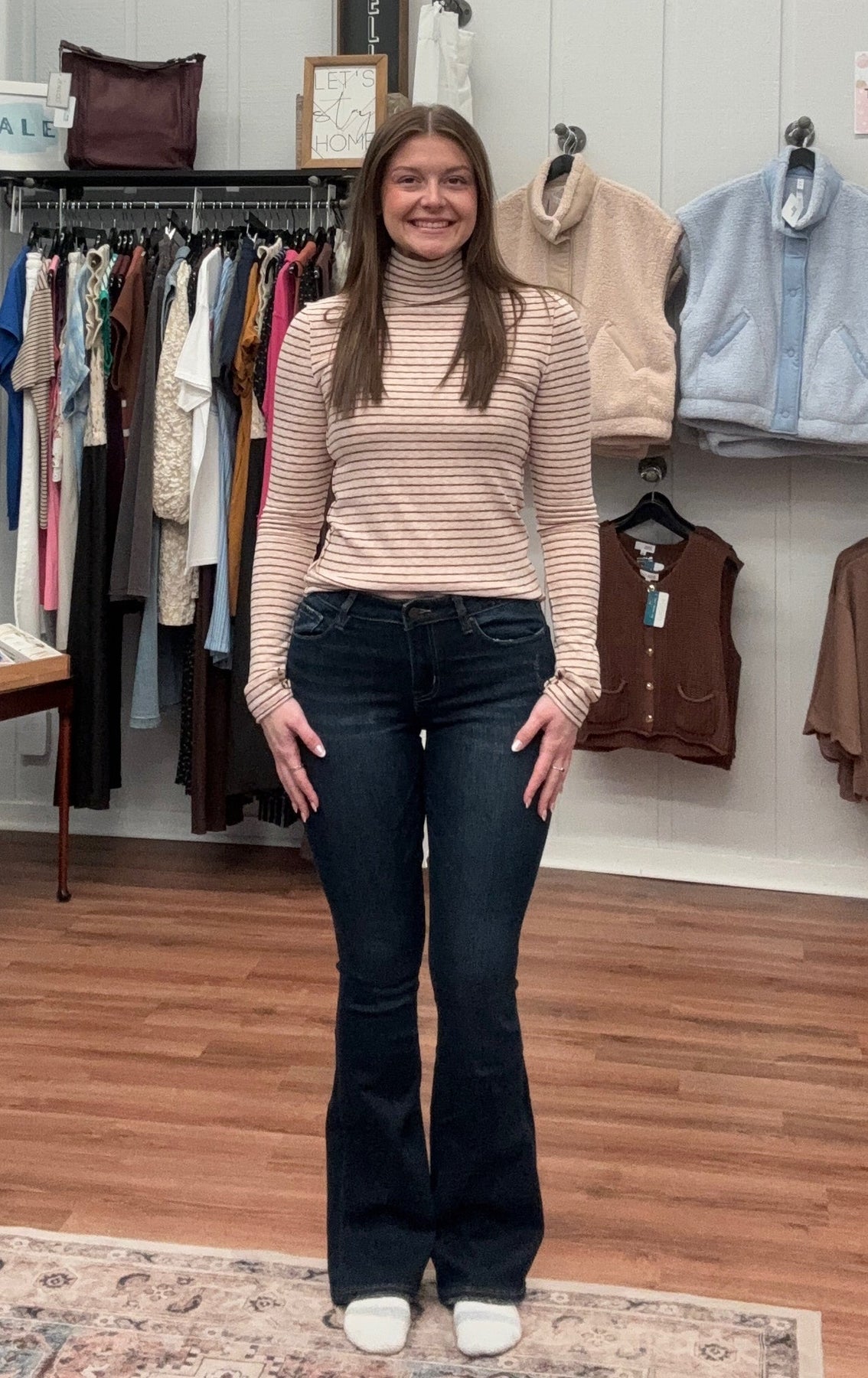 Say hello to your new favorite jeans: Tampa Mid Rise Flare Denim! These dark denim flares give you a flattering mid rise fit that elongates your legs for days. The perfect blend of style and comfort, these jeans are a must-have addition to your wardrobe. Flare up your fashion game with Tampa!