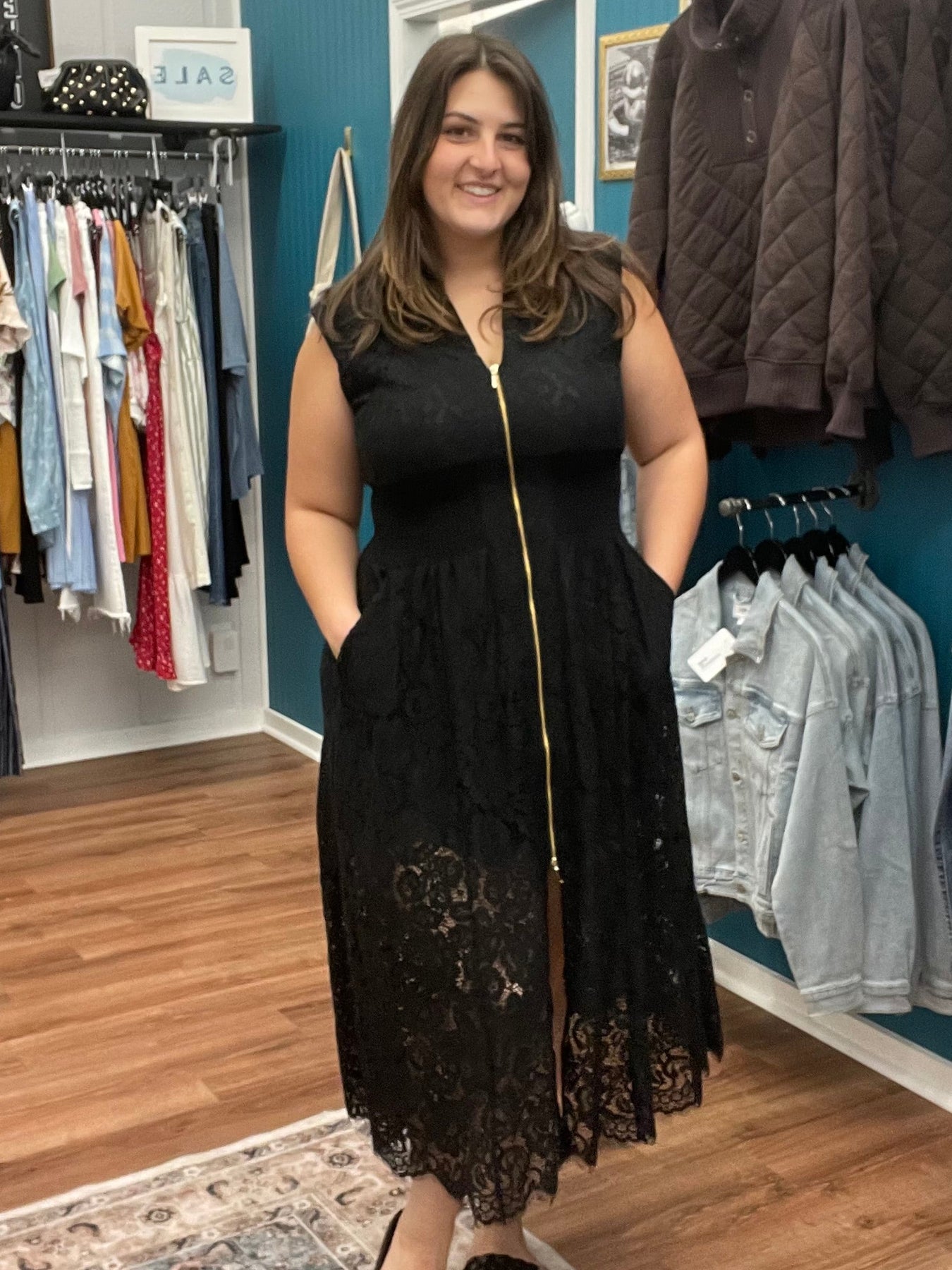 Elevate your elegance with this sleeveless lace dress featuring a sleek gold front zip closure. Its delicate lace fabric offers a refined texture, while the streamlined silhouette enhances your figure gracefully. Perfect for formal occasions or evening events, this dress combines classic design with modern sophistication for a timeless addition to your wardrobe. Dress has amazing pockets too!