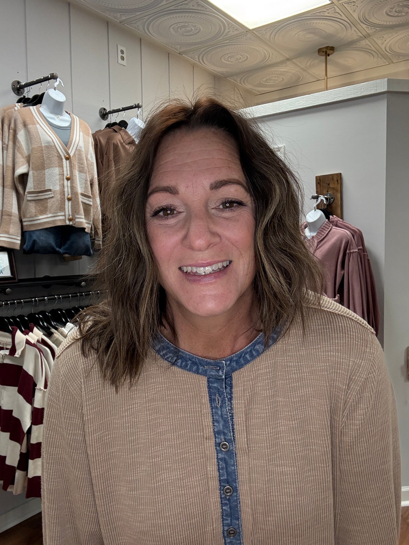 Effortless style meets casual comfort in this ribbed Henley that's anything but basic. The unexpected denim trim detail adds a touch of edge, making it the perfect layering piece for those days when you want to look put-together without trying too hard. Soft, stretchy ribbed fabric moves with you, while the contrasting trim keeps things interesting. Dress it up or down—this versatile essential belongs in every wardrobe.