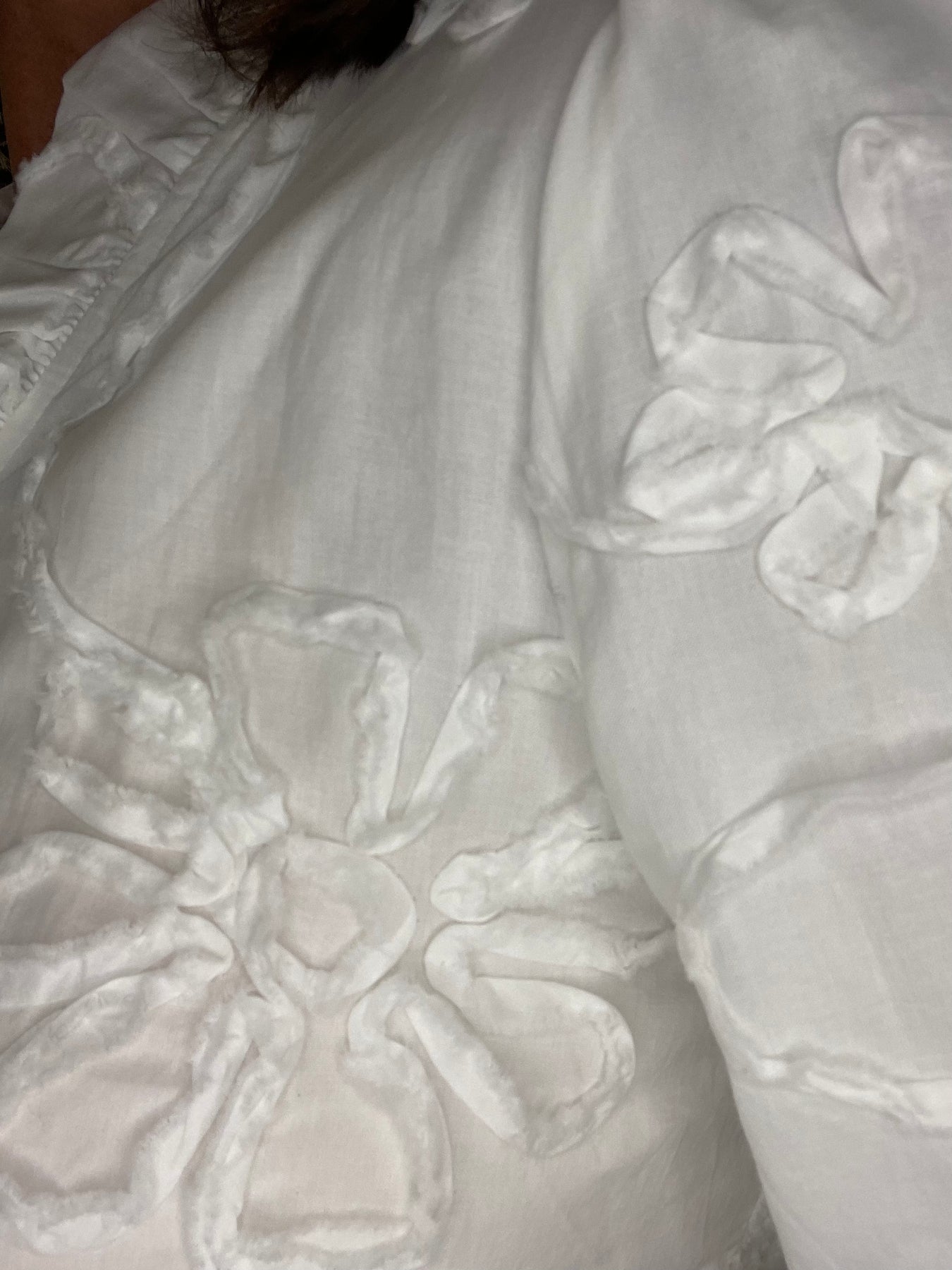This 3/4 sleeve button-down top features a sophisticated 3D floral design crafted from textured fabric, adding depth and visual interest to your ensemble. The ruffled neckline enhances its feminine appeal while maintaining a polished look, making it a versatile piece for both professional settings and stylish casual wear. The tailored fit and thoughtful details ensure comfort and elegance throughout the day.