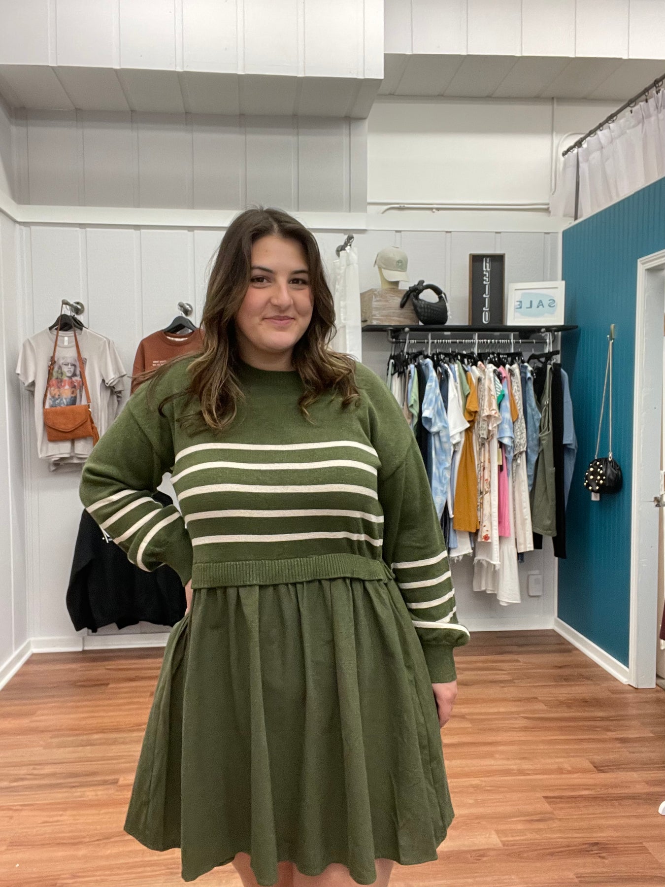 This mini dress combines cozy knit and crisp woven fabrics in a chic striped design. Featuring a comfortable crew neck and long sleeves, it offers a flattering silhouette that moves with you. Perfect for transitioning from casual days to evenings out, this dress brings effortless style and unique texture to your wardrobe.