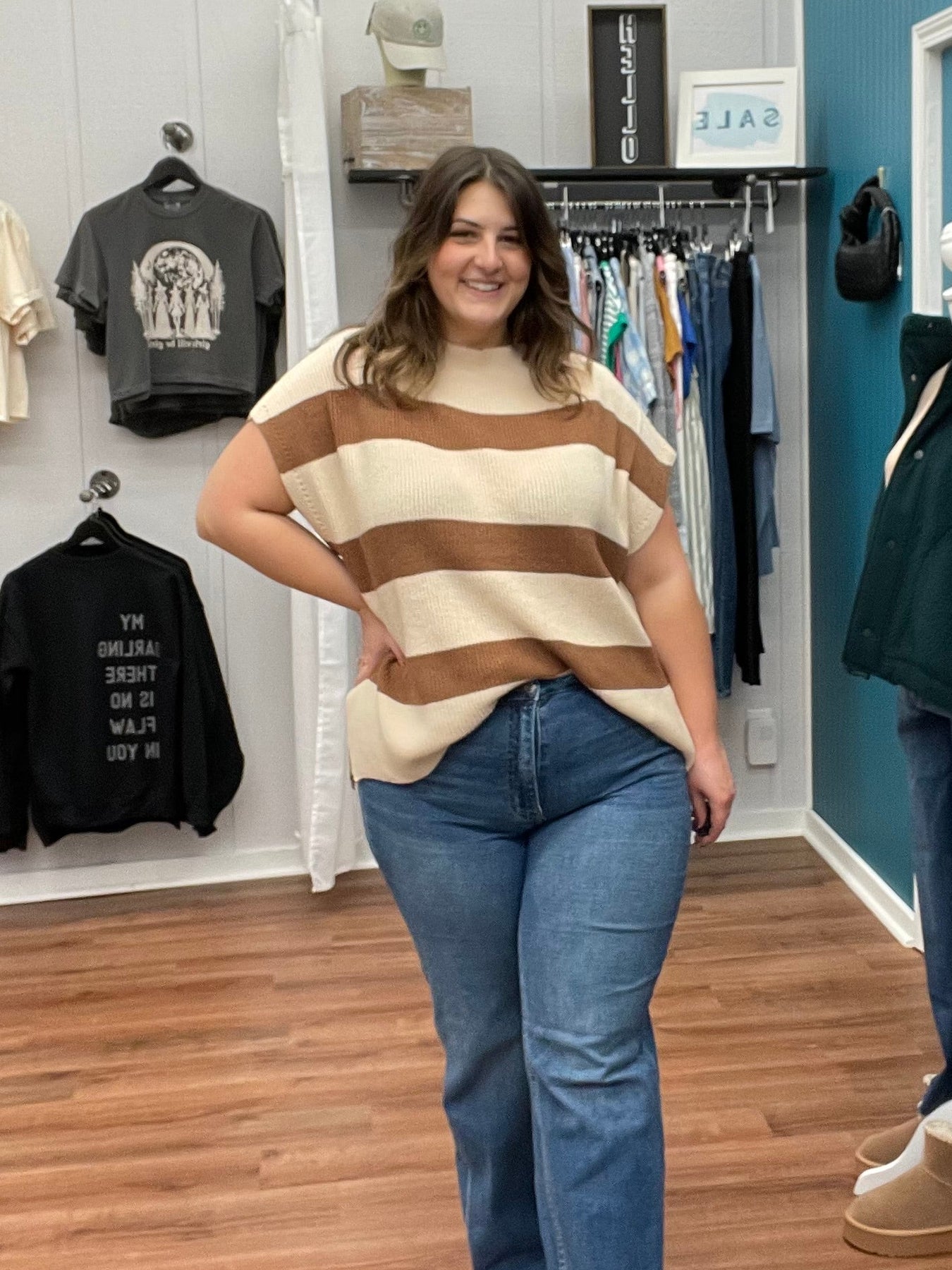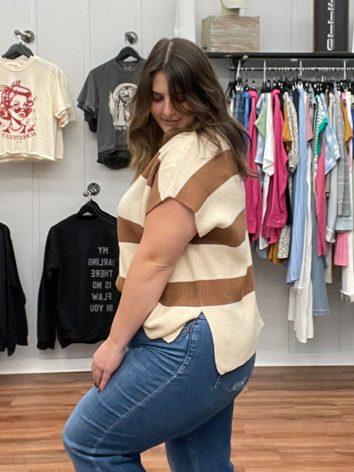 Rock this striped knit top and watch heads turn. The chic U-neckline keeps things sophisticated while those statement slay sleeves bring the sass. Crafted from buttery-soft knit fabric, it's cozy enough for all-day wear yet polished enough for nights out. Layer it over a slip dress or style it solo—either way, you're serving looks. This is the striped top that does it all, from coffee runs to dinner dates.