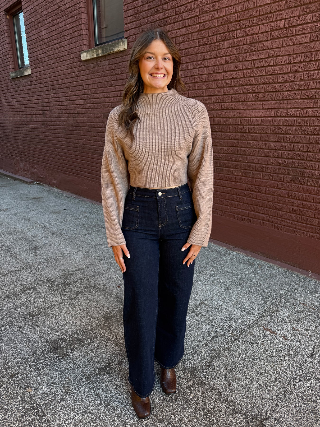 This is a sophisticated and alluring long-sleeved sweater. Crafted from a fine ribbed knit, it features a high mock neckline and a center back seam for a structured look. The sweater's defining element is its dramatic open back, creating a striking contrast between the full coverage of the sleeves and neck and the exposed lower back. The design is elegantly secured with attached, wide knit ties that are fashioned into a large, beautiful bow, serving as both a functional closure and a chic focal point.