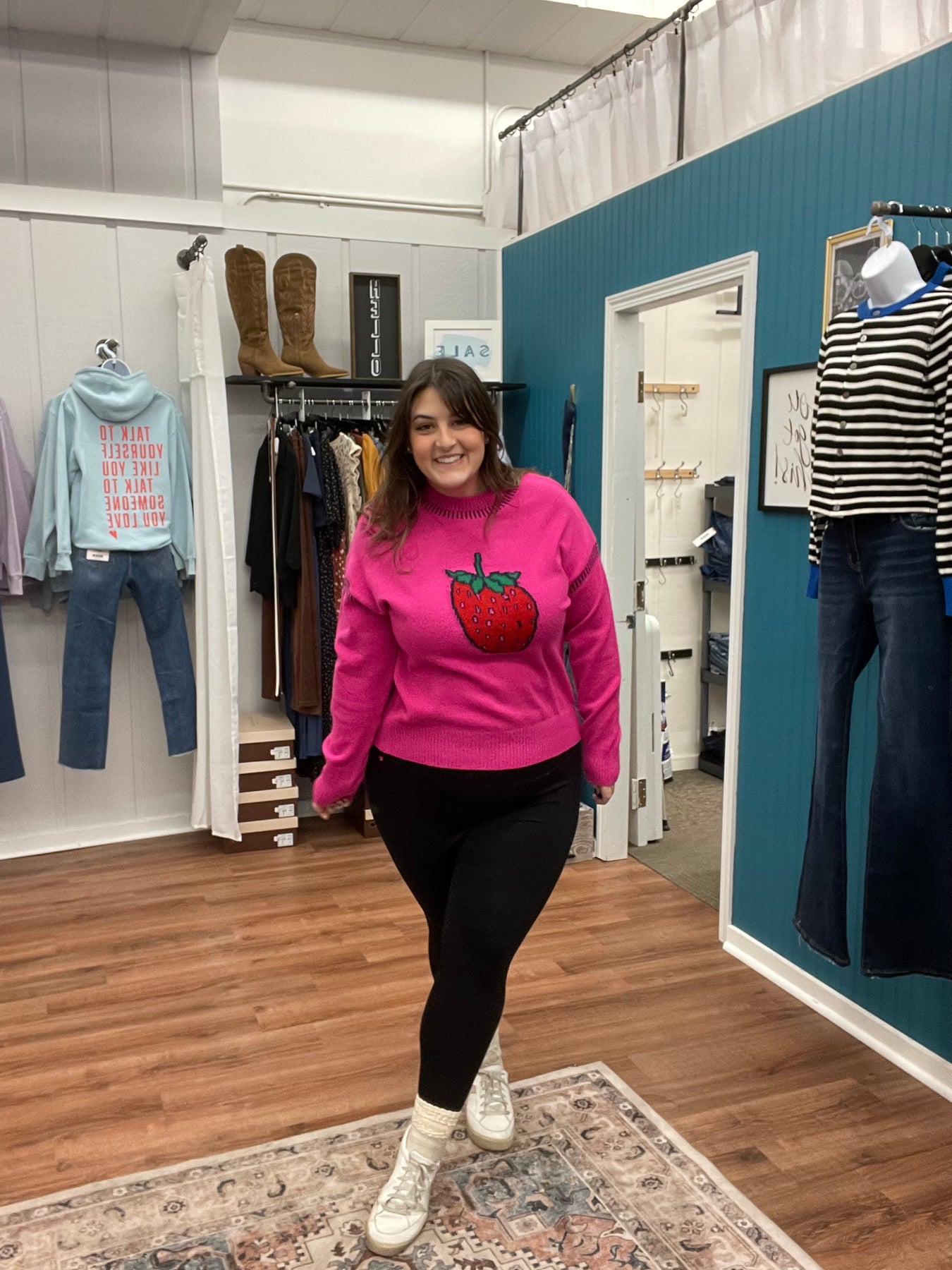Wrap yourself in cozy sweetness with our Strawberry Crewneck Sweater! This playful long-sleeve top features a charming strawberry design that brings a pop of fruity fun to your everyday wardrobe. Crafted from soft, comfortable fabric, it's perfect for lounging, casual outings, or layering through the seasons. The relaxed fit ensures all-day comfort without sacrificing style. Whether you're a fruit lover or just adore quirky, whimsical pieces, this sweater is sure to become a go-to favorite that makes you smile every time you slip it on.