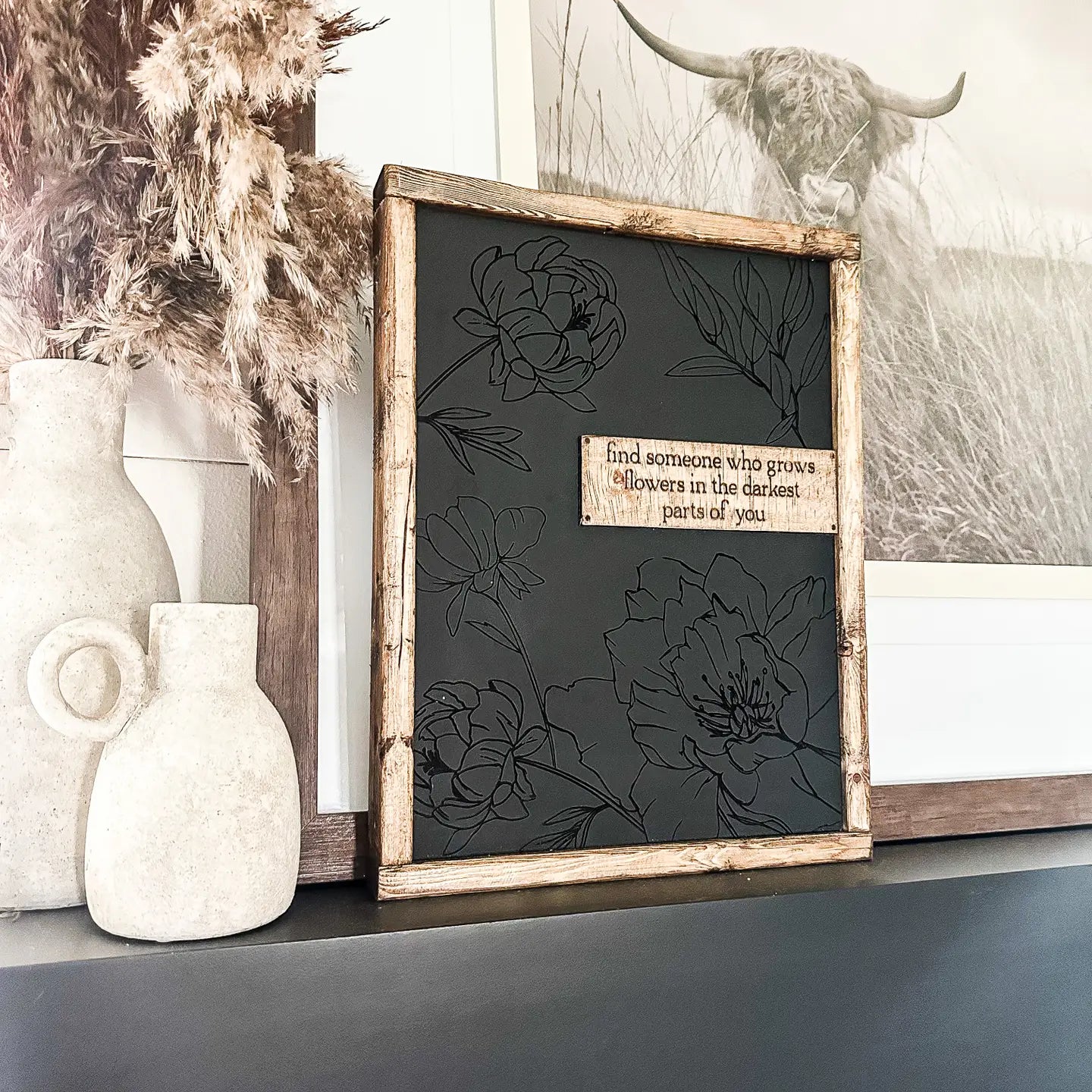 Find Someone Who Grows Flowers in the Darkest Part Wall Sign This charming 15" x 12" wooden wall sign brings warmth and wisdom to any room. Crafted from rich special walnut, it features beautifully engraved floral lettering that catches the light just right. Perfect for plant lovers, gardeners, or anyone who appreciates a little botanical inspiration, this piece celebrates resilience and beauty in unexpected places. Hang it in your bedroom, living room, or garden nook for a daily dose of encouragement and natural elegance.