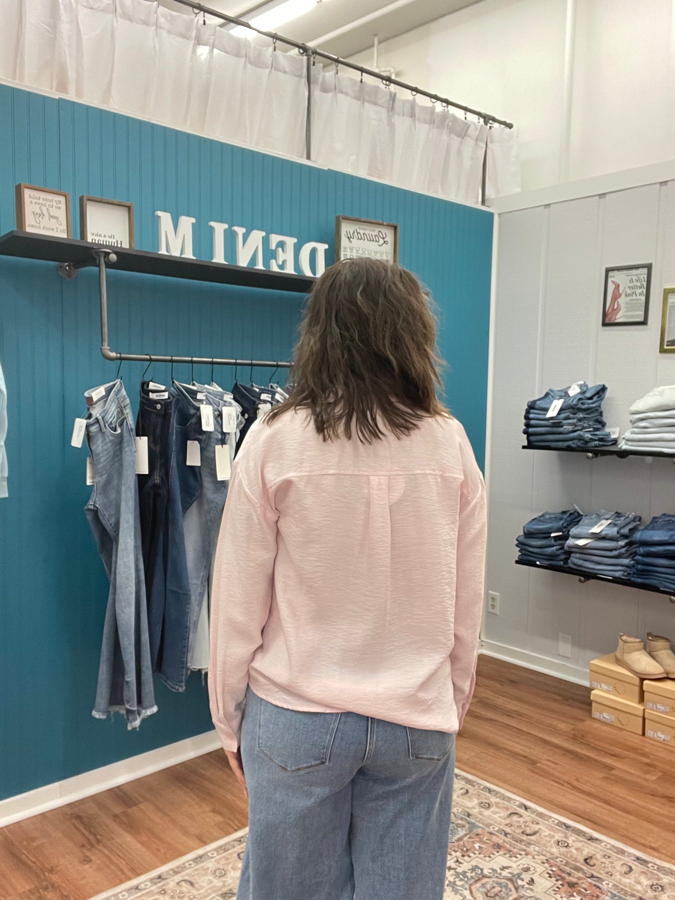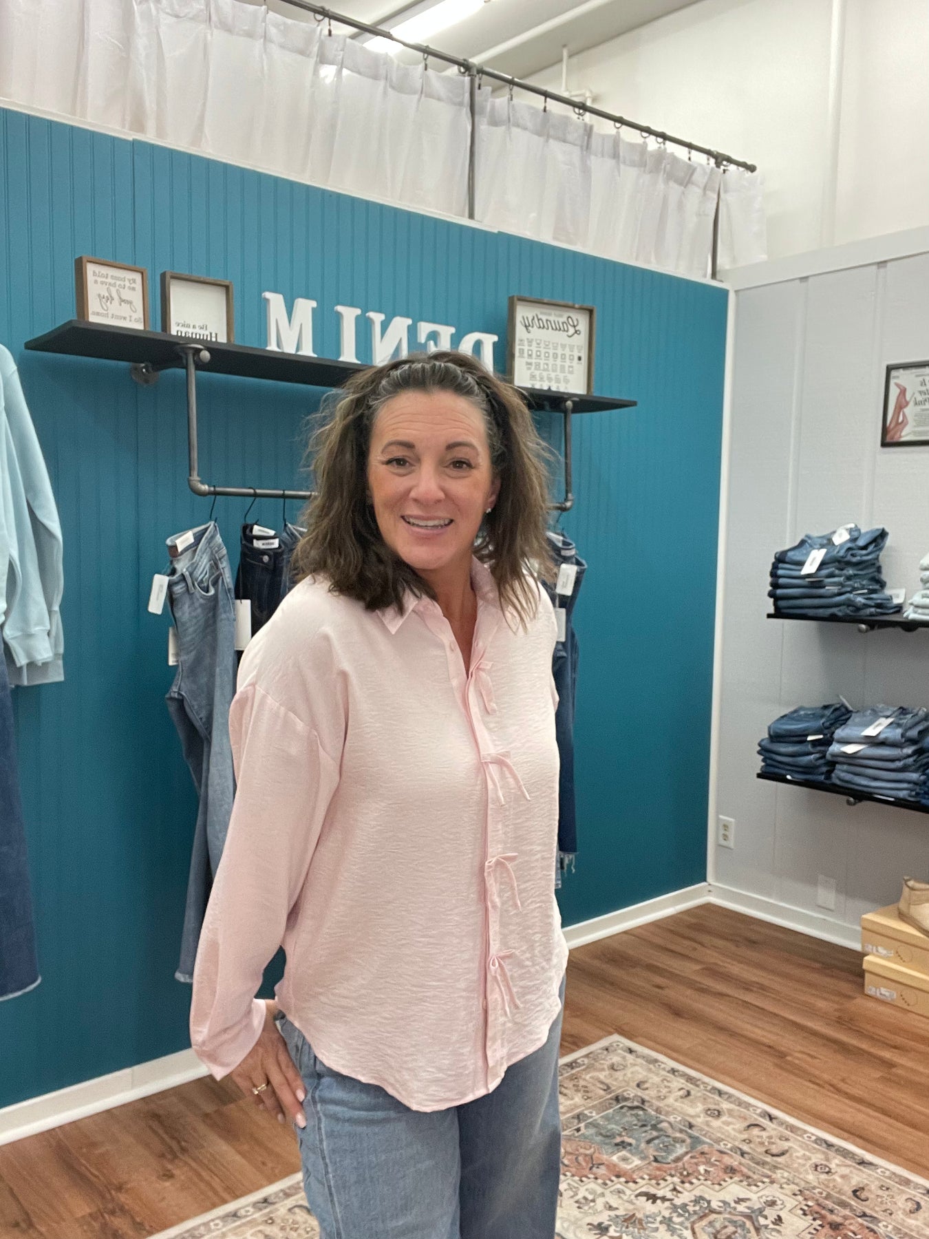 Effortlessly elevate your wardrobe with this lightweight linen-blend button-down shirt, designed for versatile layering and transitional wear. The crinkled fabric adds subtle texture and movement, while delicate ribbon tie details at the front placket introduce a refined touch. A classic collared neckline, functional button cuffs, and long sleeves complete the polished silhouette. The relaxed fit ensures comfortable all-day wear without sacrificing sophistication, making this piece an essential addition to any curated closet.