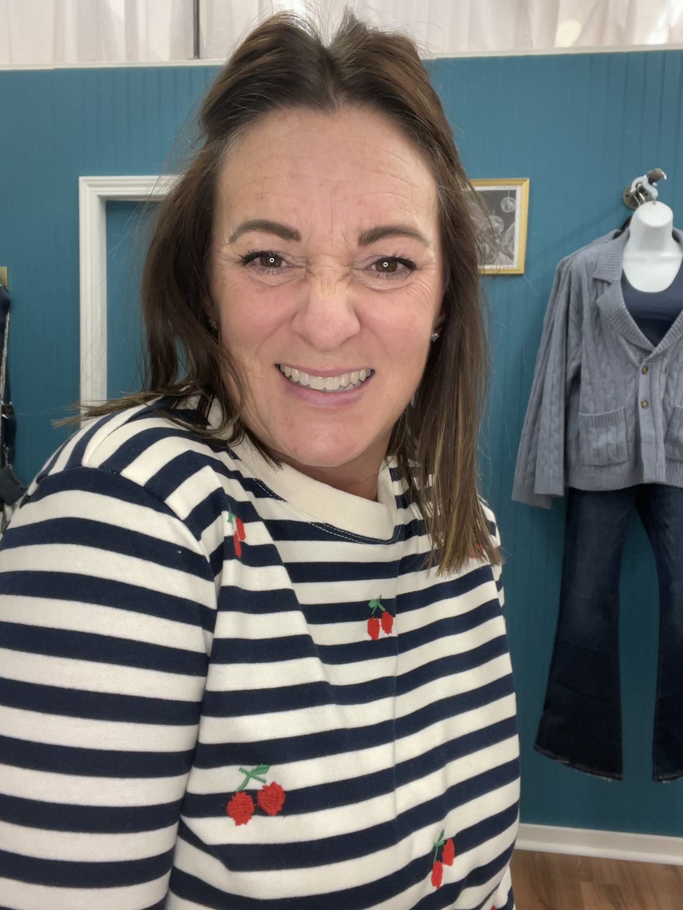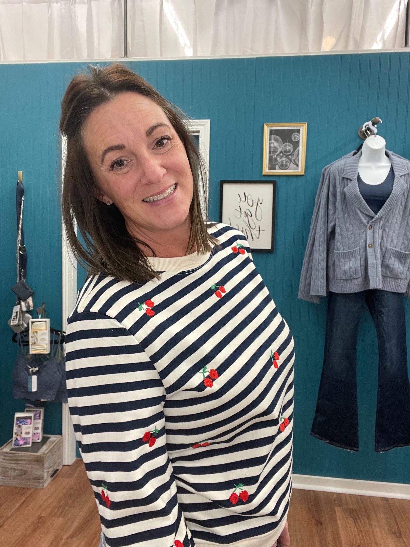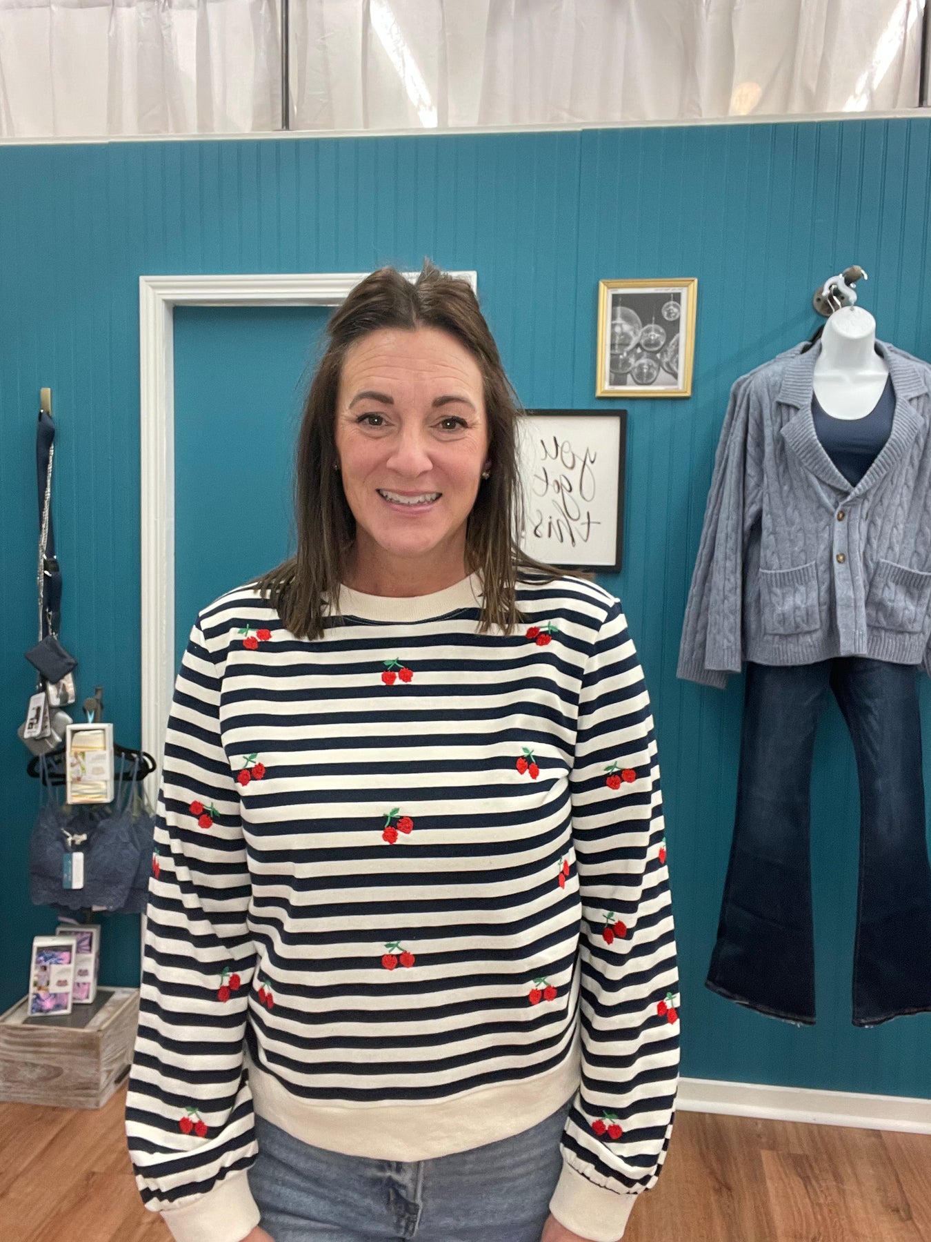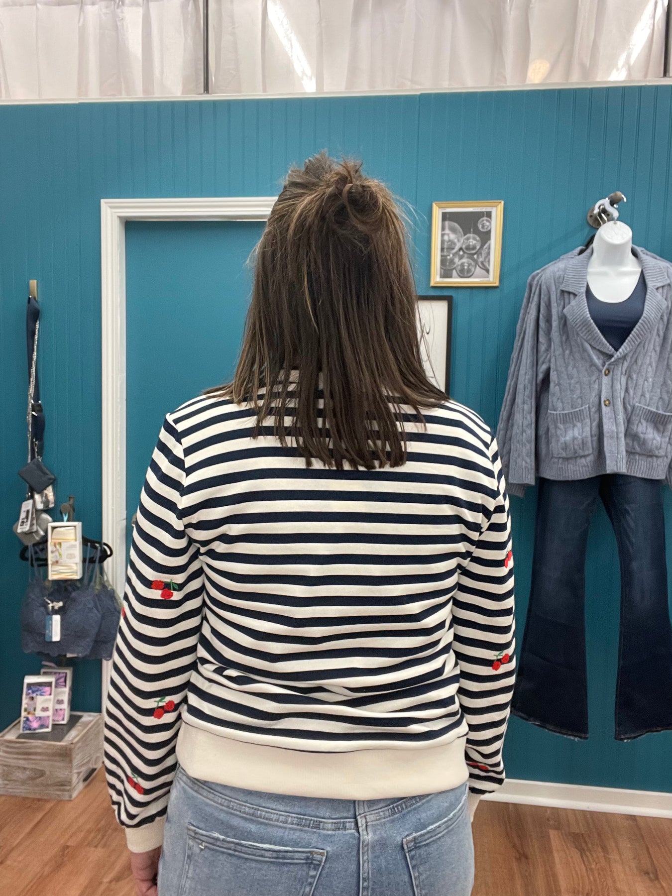 This versatile long-sleeve striped top combines effortless style with thoughtful design details. The classic stripe pattern provides a timeless foundation, while hand-placed cherry embroidery adds a distinctive focal point that elevates the piece beyond basic basics. The relaxed silhouette works beautifully for casual outings, weekend errands, or layered styling options. Quality construction ensures durability through repeated wear and washing, making it a reliable staple that pairs seamlessly with your existing wardrobe. An understated yet memorable choice for those who appreciate refined casual wear.