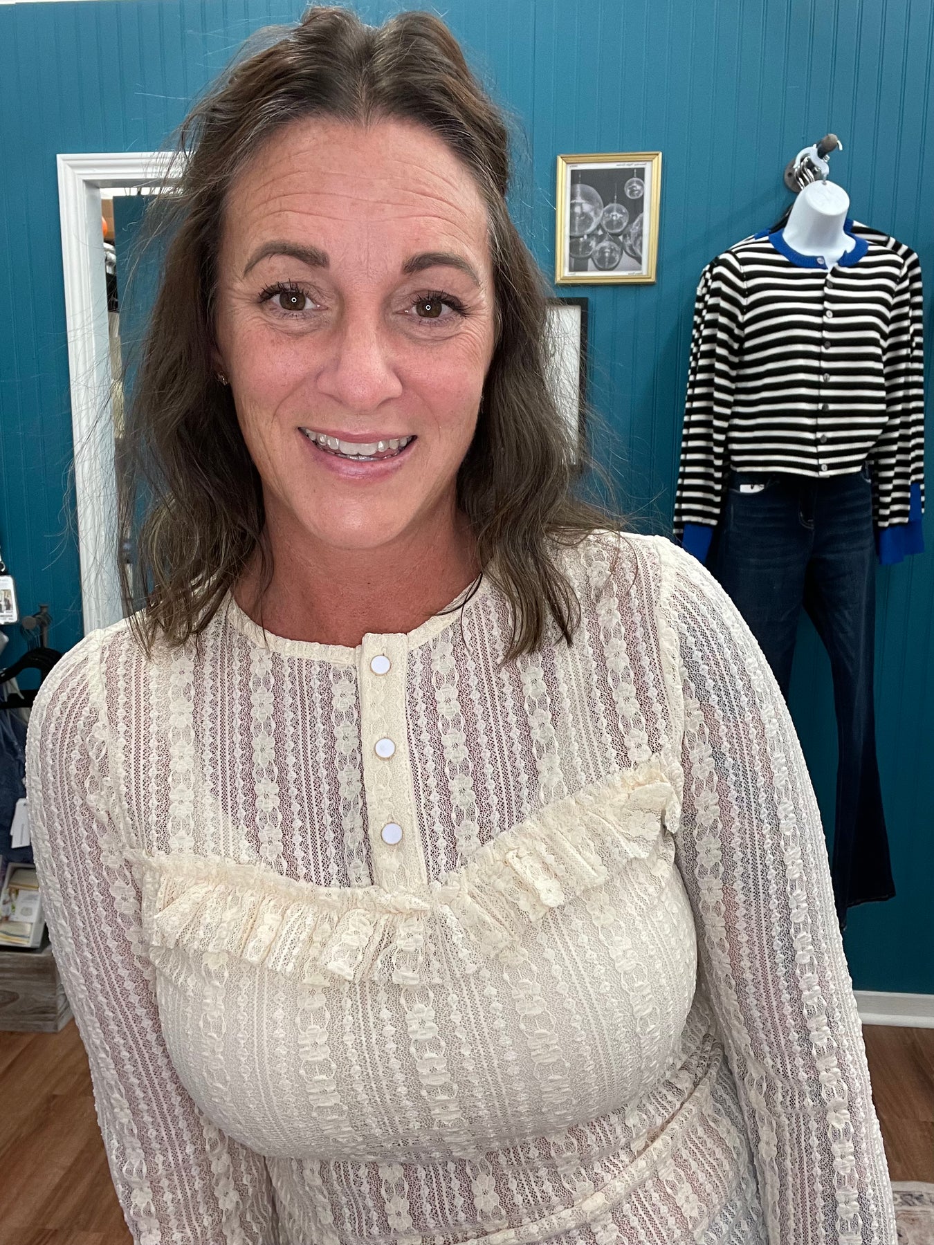 Embrace your bold side in this daring stretch lace henley neck top that commands attention. The fitted silhouette hugs your curves while delicate lace fabric adds an edgy-feminine touch. Long sleeves finish with an eye-catching ruffle hem that elevates the look from basic to breathtaking. Perfect for layering under sheer pieces or wearing solo as a statement piece, this top blends sophistication with an unapologetic attitude.