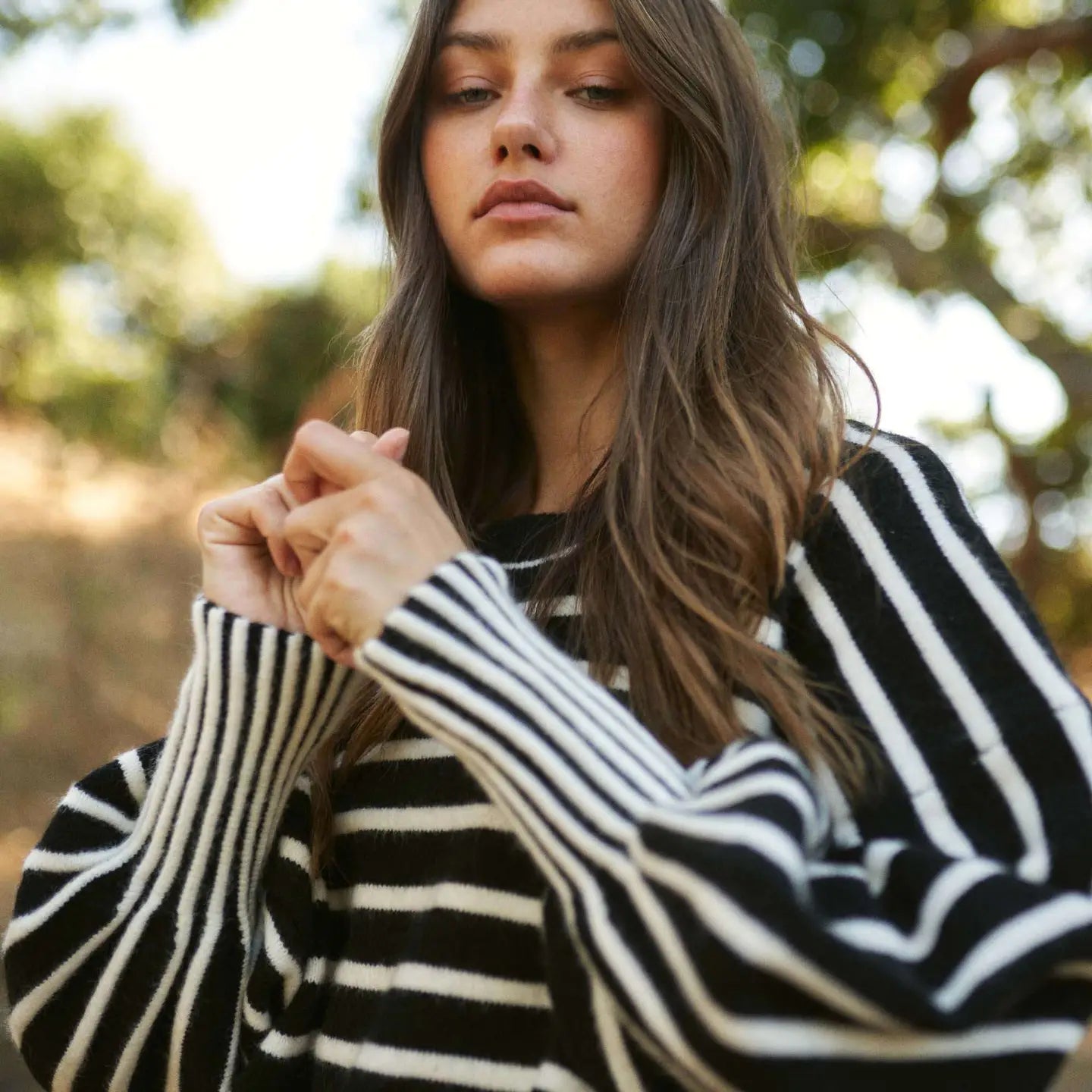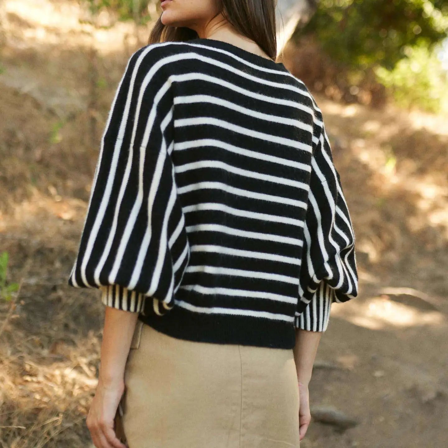Puff long sleeve crew neck striped sweater. The sleeves set this one apart, contrast stripes are adorable and flattering!