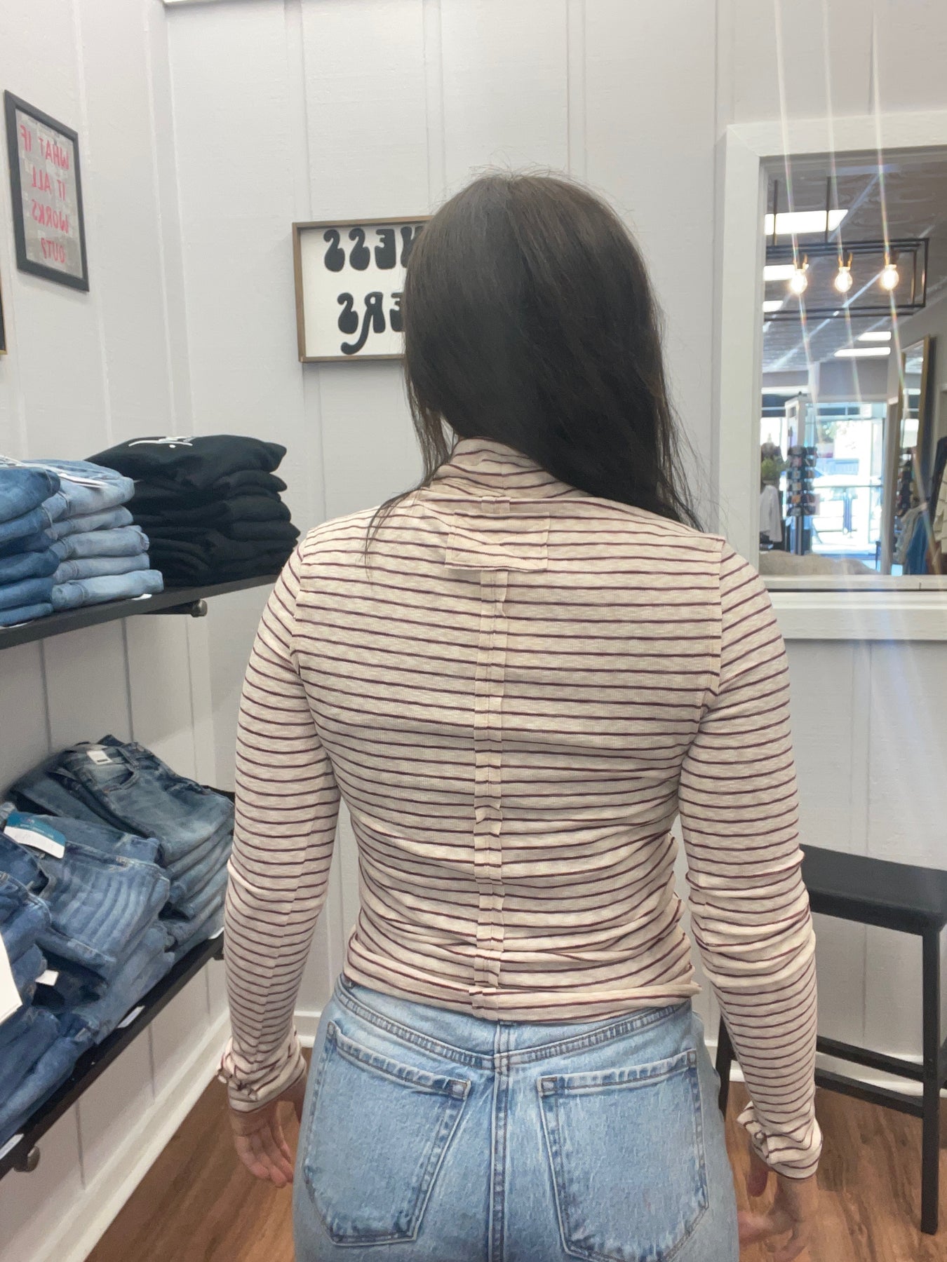 This striped turtleneck long sleeve top features integrated thumb holes, enhancing comfort and ensuring sleeves stay securely in place during wear. Its classic turtleneck design provides added warmth and a sleek silhouette, making it an ideal layering piece for cooler seasons. Crafted to balance style and functionality, this top offers both refined aesthetics and practical benefits for everyday wear.