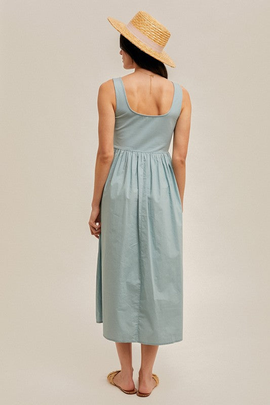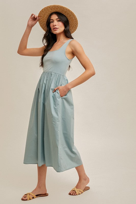 The Amayah Mixed Media Midi Dress combines sophisticated textural elements with a flattering scoop neckline and midi length. Designed with contrasting fabric panels that create visual interest and dimension, this versatile piece transitions effortlessly from office to evening events. The thoughtful construction ensures a comfortable fit while maintaining a polished silhouette. Hidden side pockets.