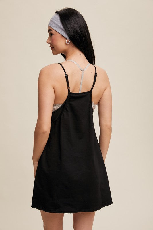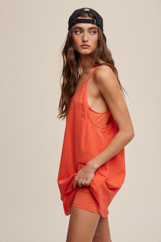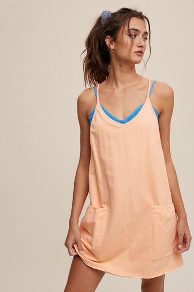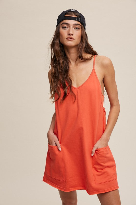 Sporty mini dress with built in romper liner!  Featuring a v neckline, adjustable shoulder straps, big front patch pockets, finished clean hem and the romper is adorable and perfection!