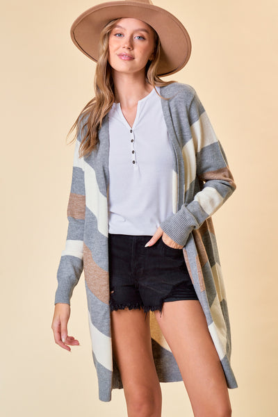Super soft long cardigan featuring an amazing chevron print in classic colors.