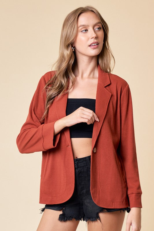 Placket sleeve knit blazer that has some good stretch to it for complete comfort. Wear to the office for a casual day out.