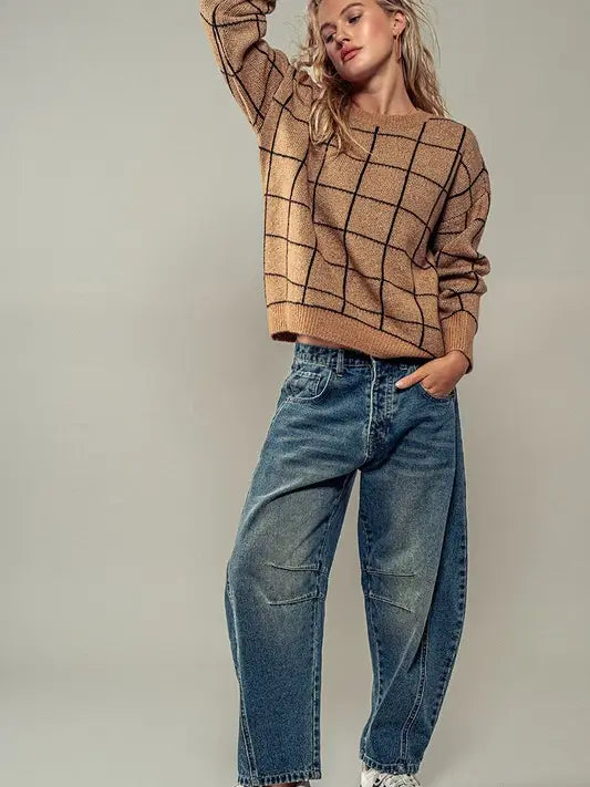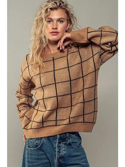 Speckled knit grid sweater with ribbed trim and crew neckline. We love the grid print and it is so cute and cozy!