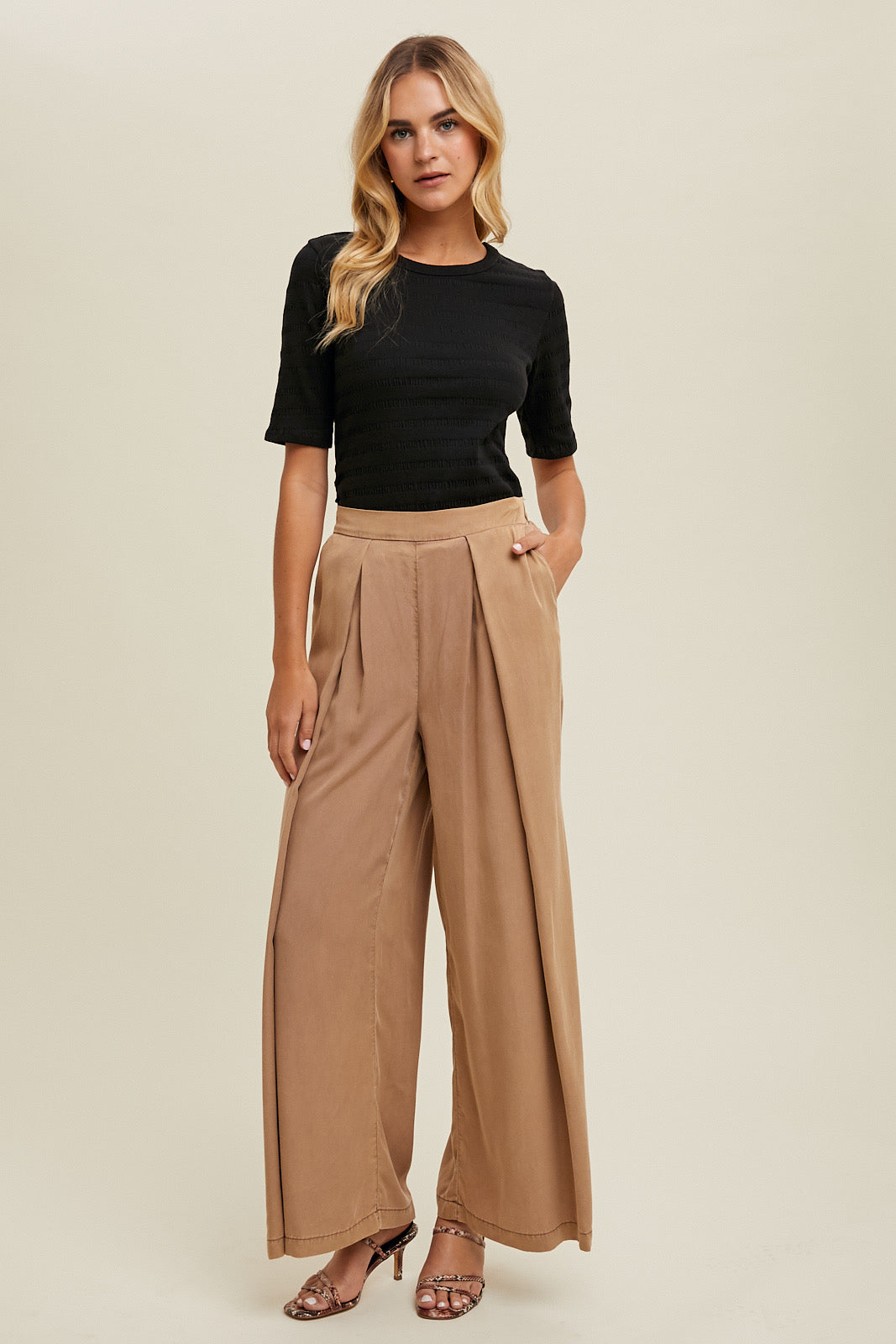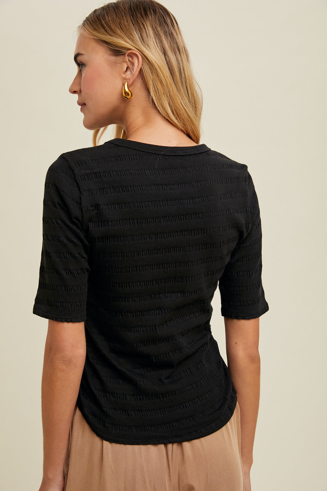 Ribbed knit short sleeve top featuring a side rouched detail. Very flattering and perfect to complete any look!