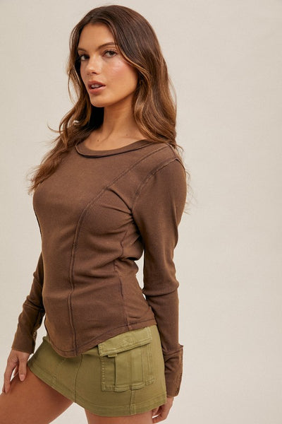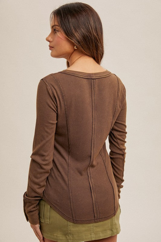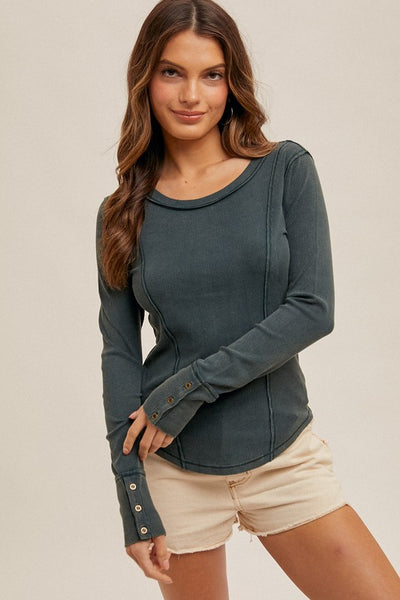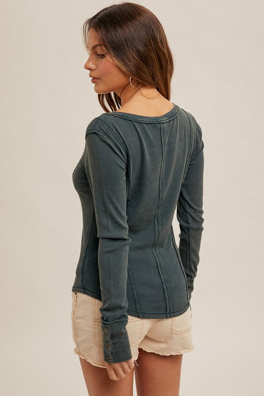 Wide boat neck snow washed ribbed henley top.  Super soft to the touch and the perfect pairing piece.