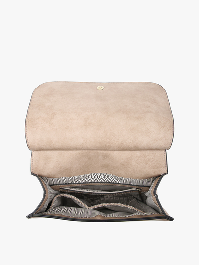 Contrast Crossbody w/ Guitar Strap features monogrammable, flapover snap closure, detachable/non-adjustable guitar strap, inner zip and slip pockets, back zip pocket, decorative tassel