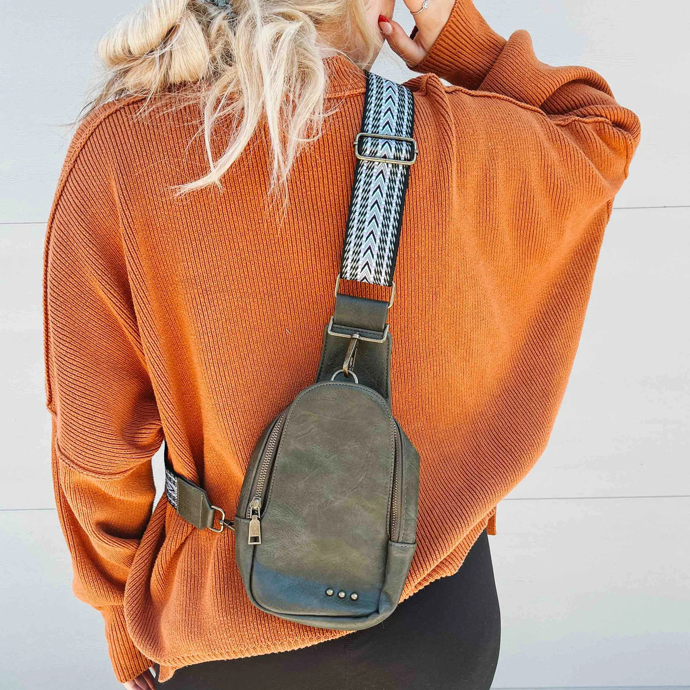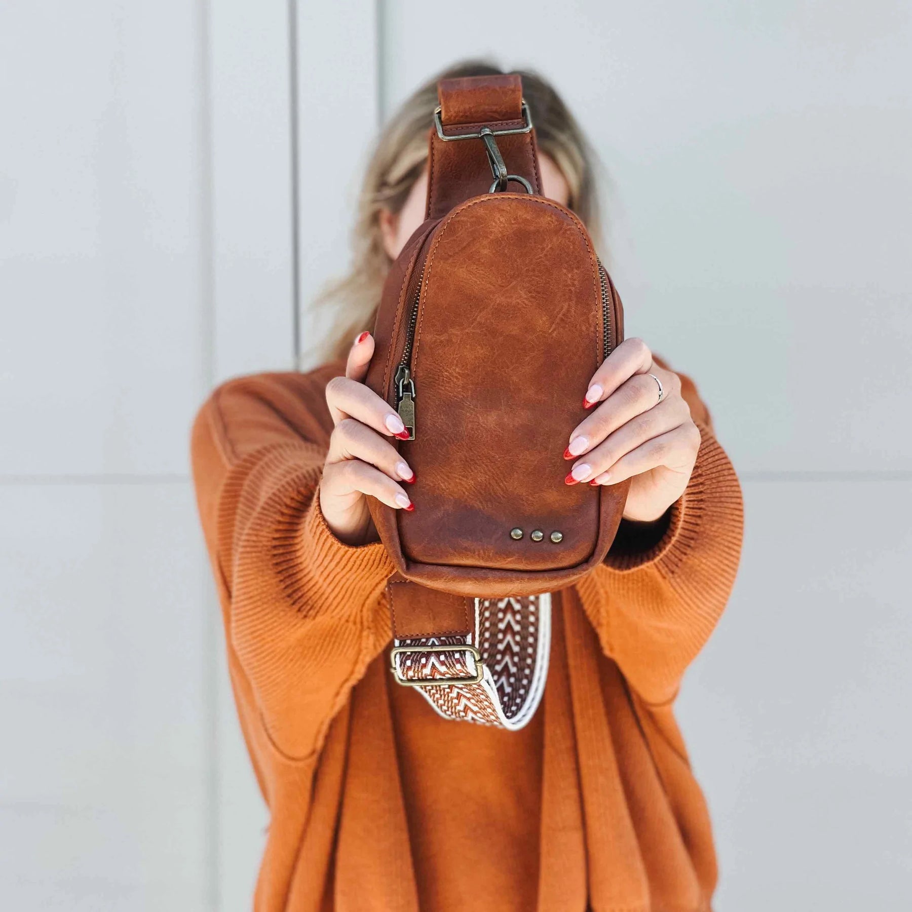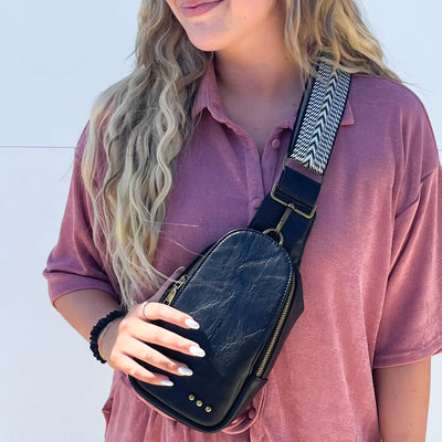 Our Jordan Sling Bag is a true show stopper! This vegan leather bag has a woven geometric guitar style strap and two pockets for storage. The large pocket has both a hook and zipper closure and the other has a magnetic snap closure that leads to a place to store your cards/cash! Can it get any better than that?