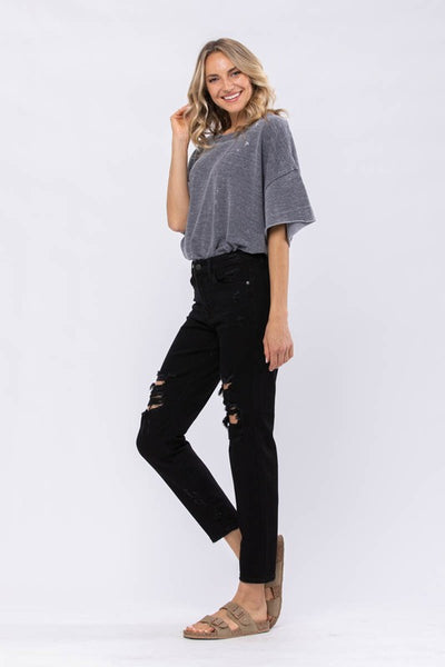 High wasited distressed boyfriend fit. These are a flattering fit and offer a little distressing. Cute, cozy, and like wearing leggings!