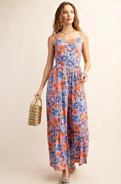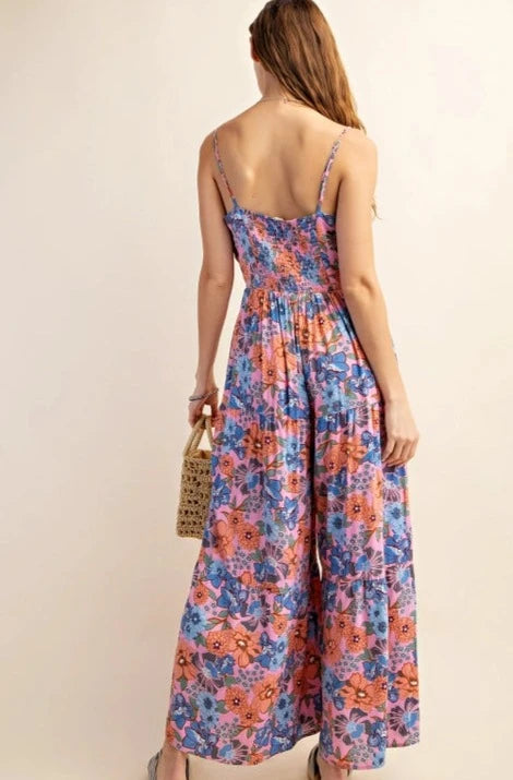 Floral tiered back smocked side pockets jumpsuit. This gem features wide legs, floral print, smocked back and a square neckline.