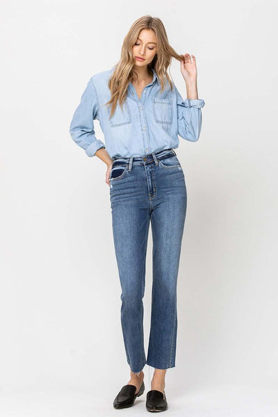 Comfort Stretch Denim, ankle length, straight fit, raw edge, clean cute hem with a high wait and slim fit through the hip and thighs. Katie is sure to be a go to staple denim for all fits and figures.