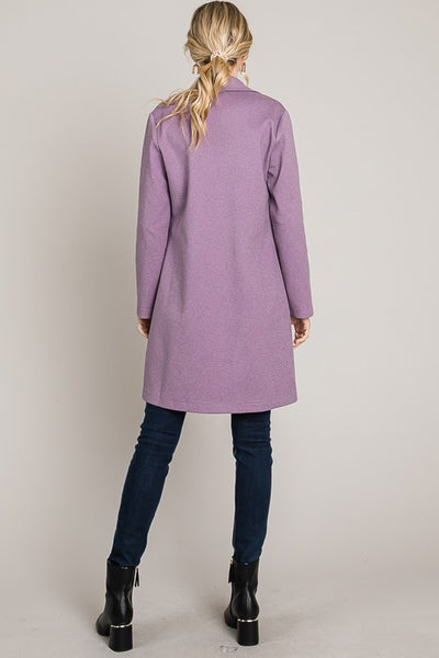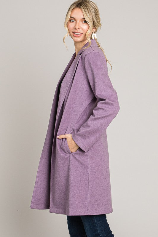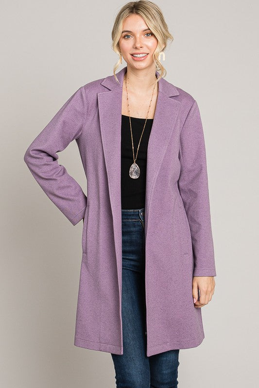 Brushed twill blazer jacket. Fabric has stretch to it or maximum comfort, buttonless open front and extended lapel notched collar. Usable welt pockets as well.