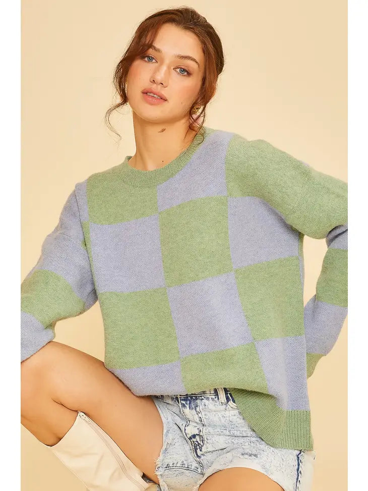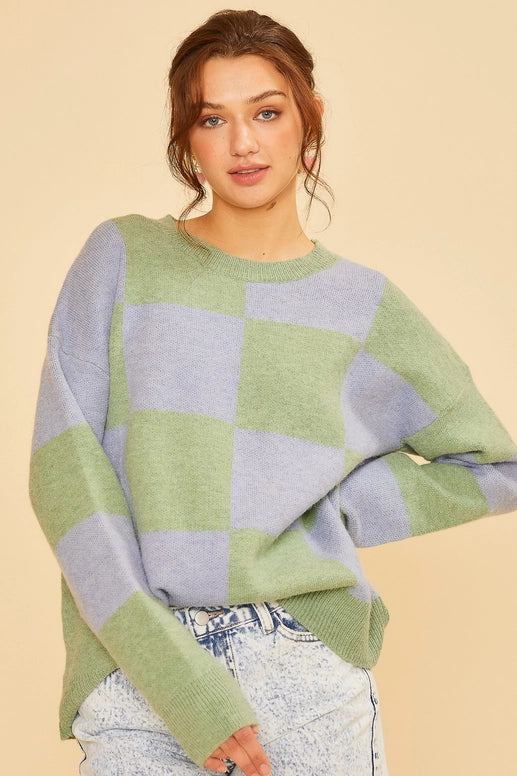 Checker board round neck sweater top featuring a check plaid pattern, premium anit pilling, round neckline, loose fit, and super soft touch sweater knit.