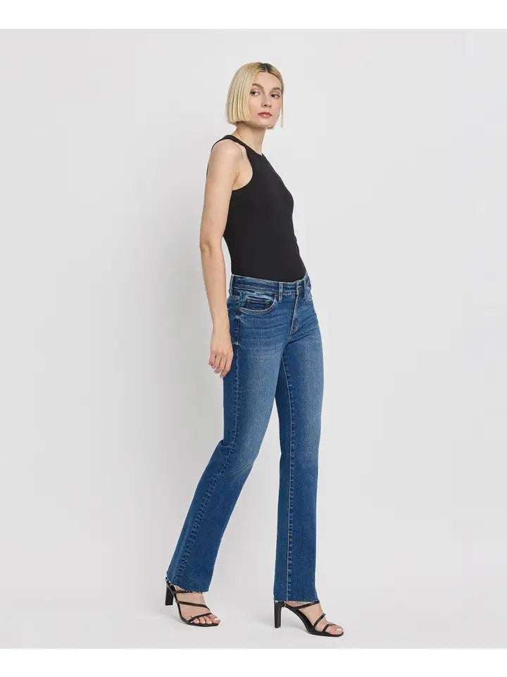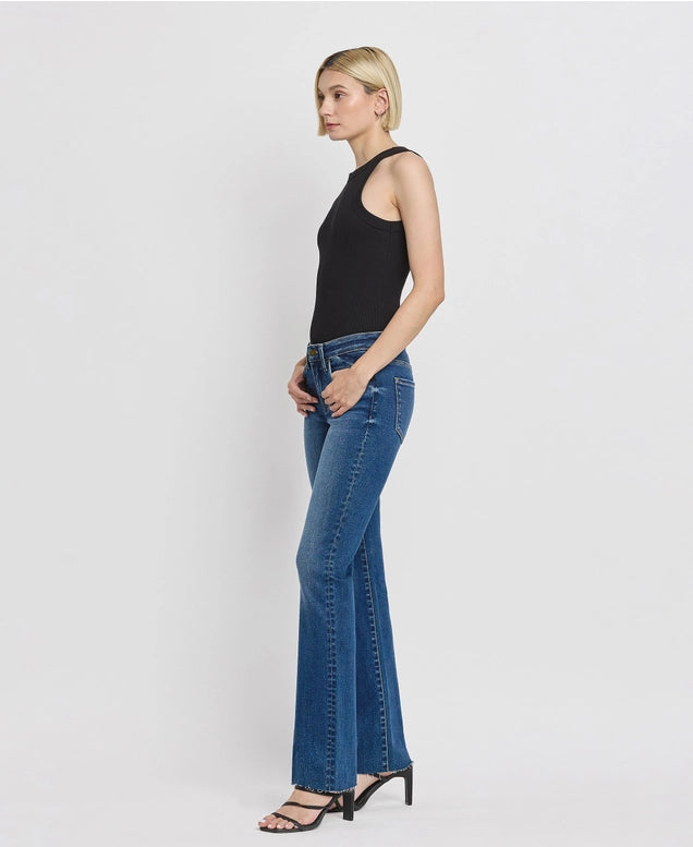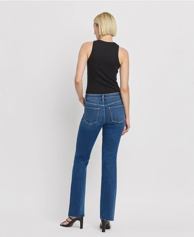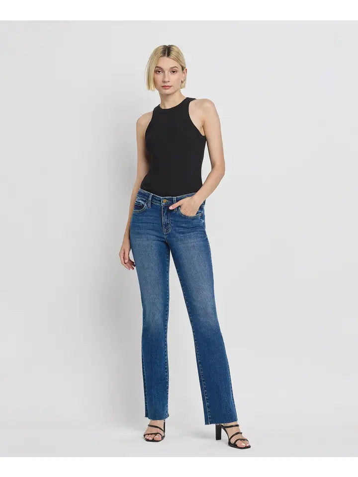 Mid rise clean cut raw hem denim. These are a full length, ankle slim cut featuring comfort stretch denim.