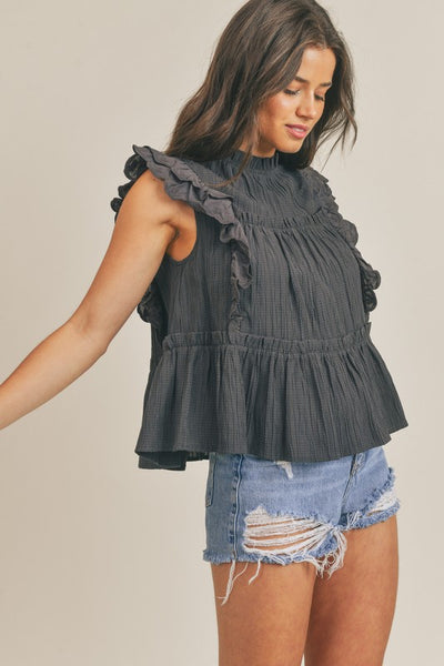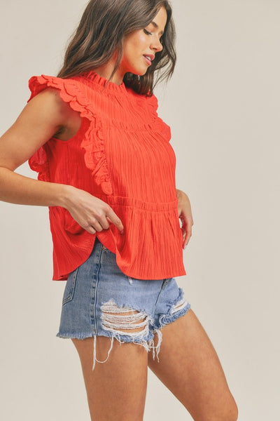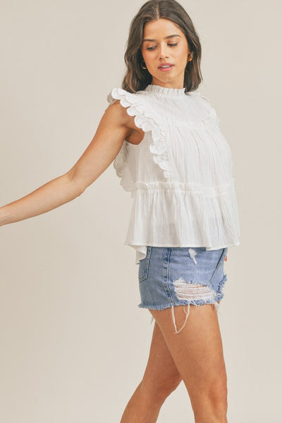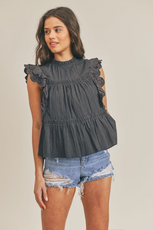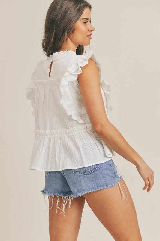 Delicate top with ruffle sleeve.  Keyhole back and flattering fit.  Pair this with your favorite skinny denim or loose fitting short for a fun and unique look!  This top is lined.