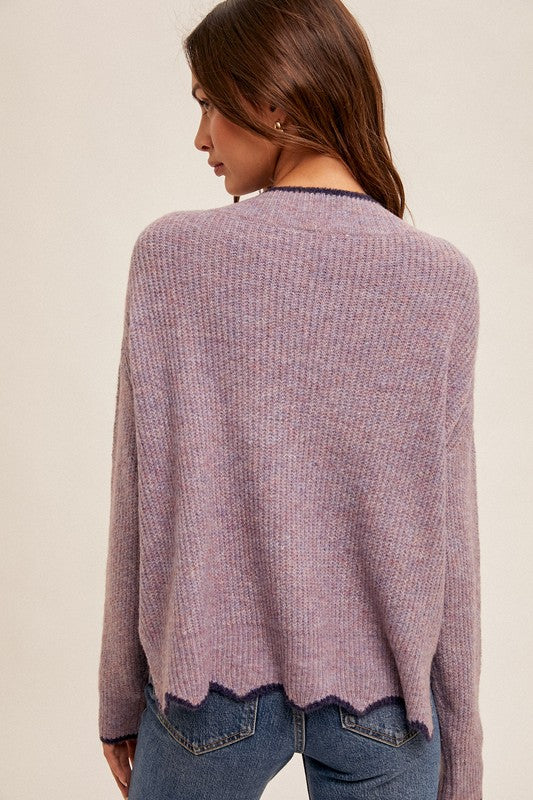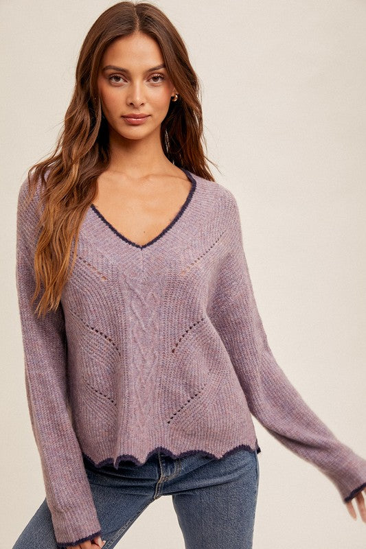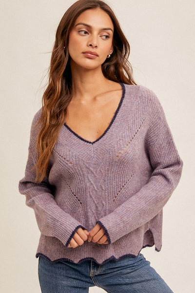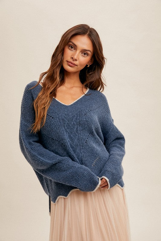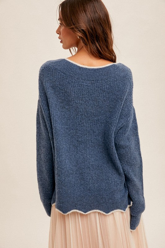 Scallop edge color block V Neck oversized sweater. Pull this over for a unique and fun look. Super soft and extremely comfortable.