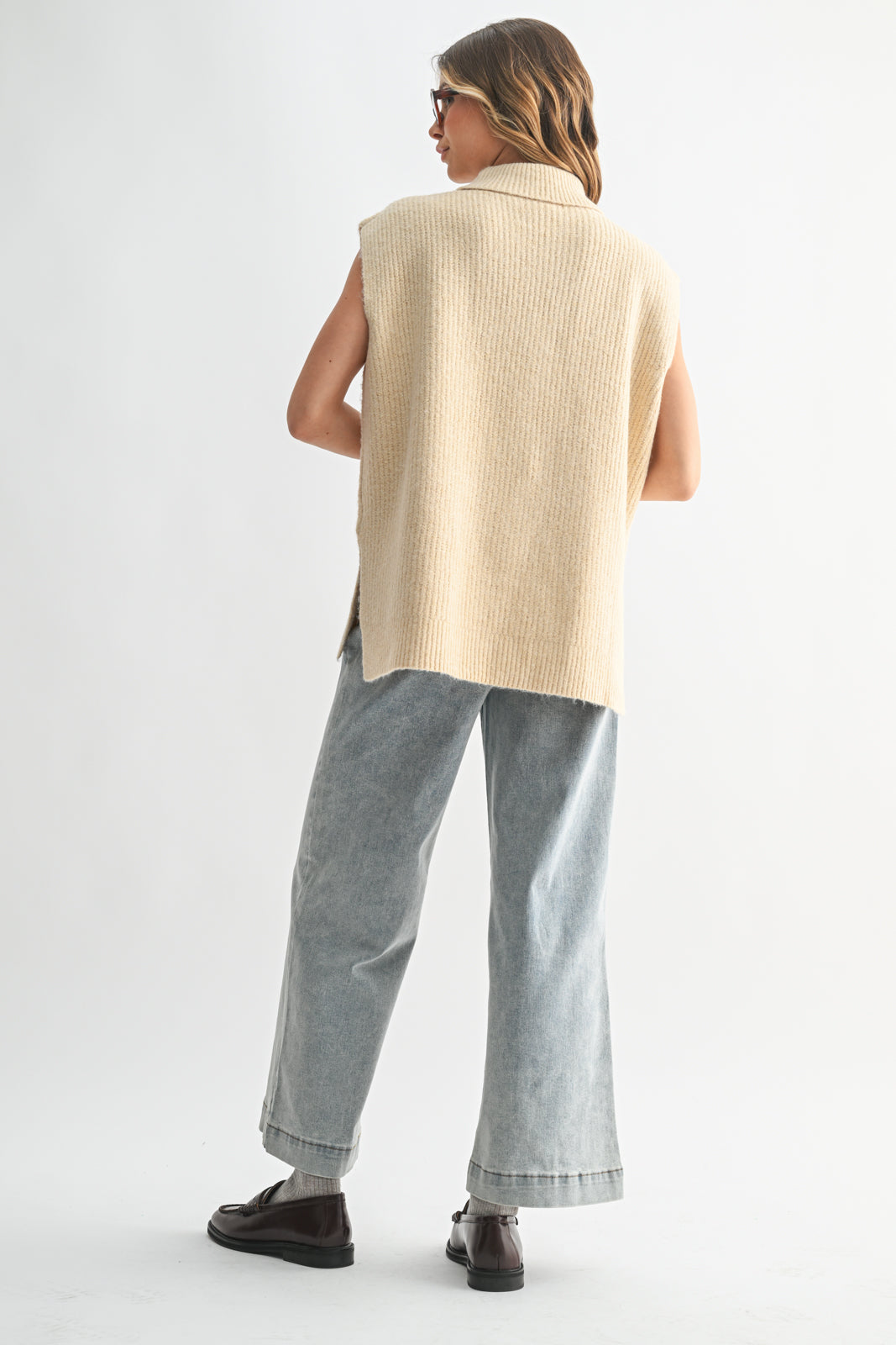 This brushed high neck sweater vest offers a refined blend of comfort and style. Its soft fabric and elegant high neckline create a polished look, while the side slits provide subtle movement and modern detail. Perfect for layering, it enhances any sophisticated outfit with understated charm.
