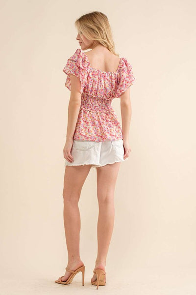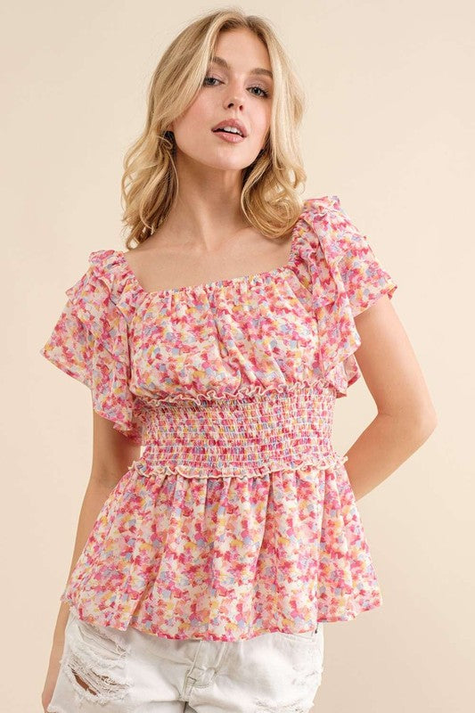 Mulit colored abstract print that features a tiered ruffle sleeve with smocked waistband top.  The colors pop and this top is extremely comfortable.