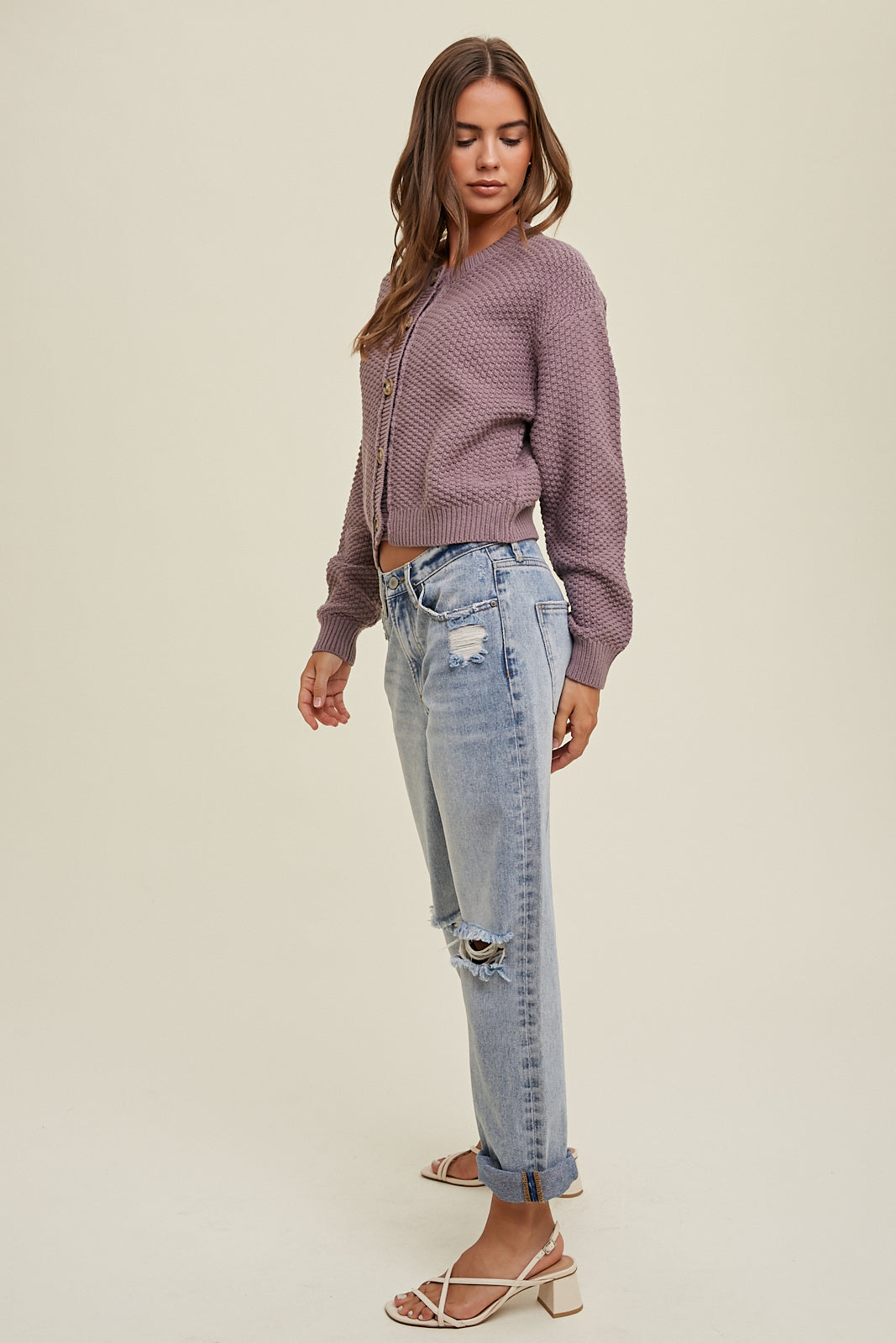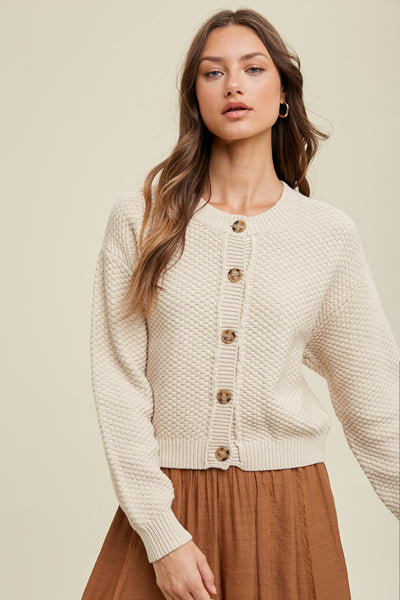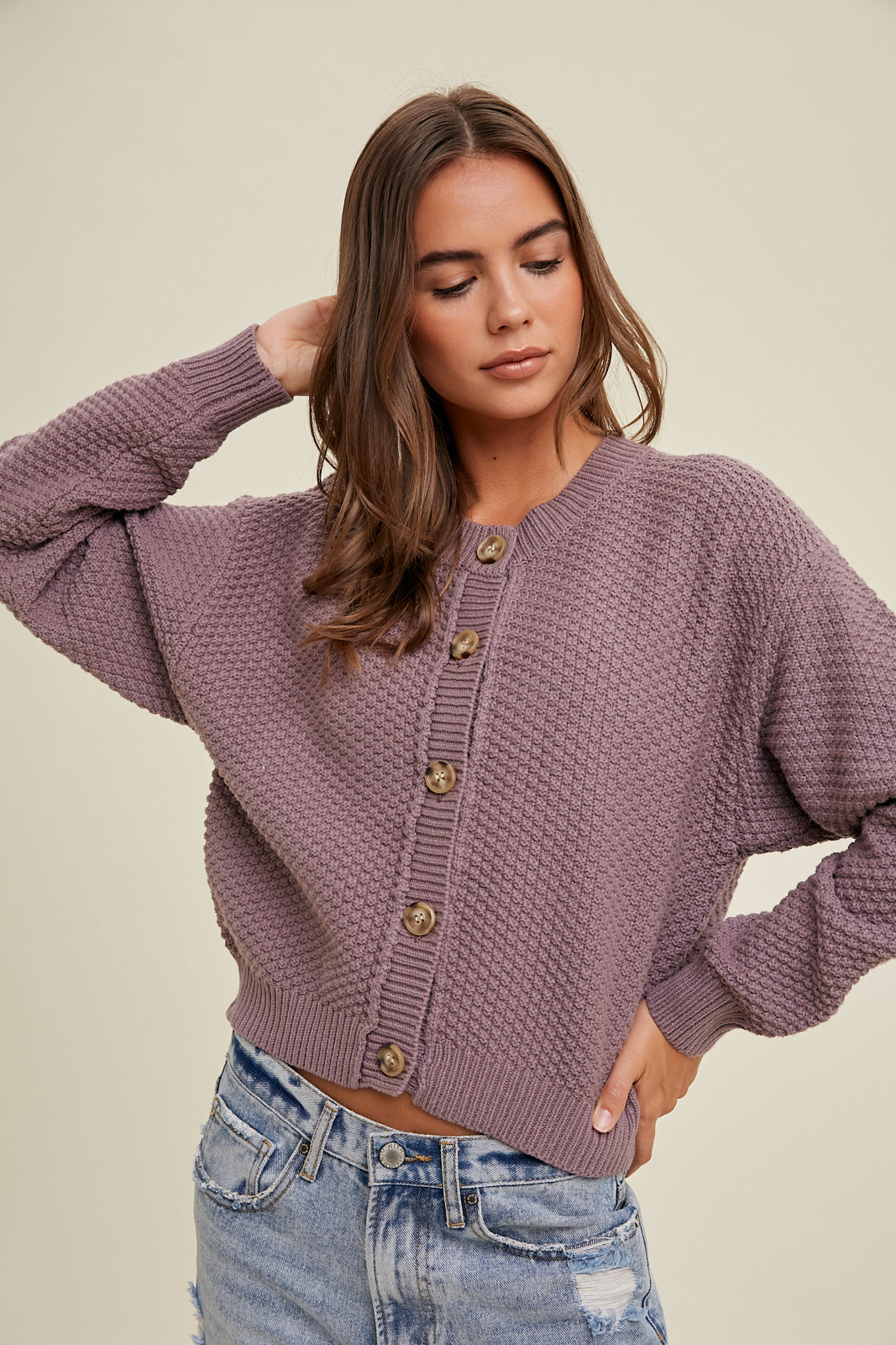Textured button up cardigan. Pure warmth and perfect addition for any look. Buttons are functional to wear alone or as a layer.