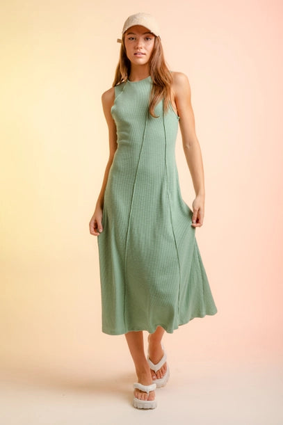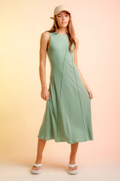 Sleeveless exposed seam rib knit maxi dress. Featuring a stretch cotton slub rib knit fabric.