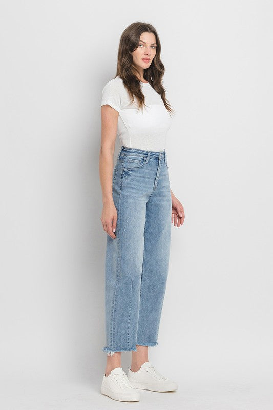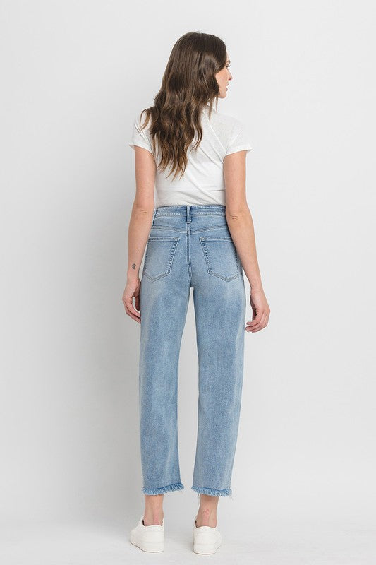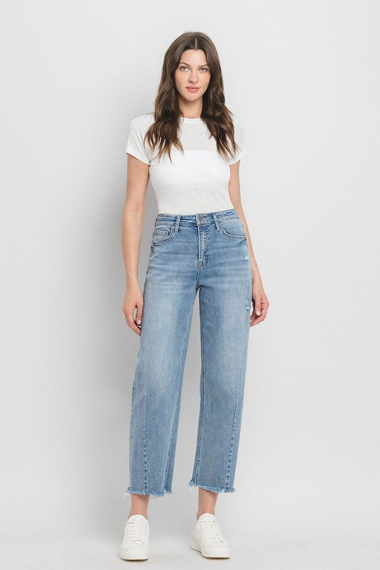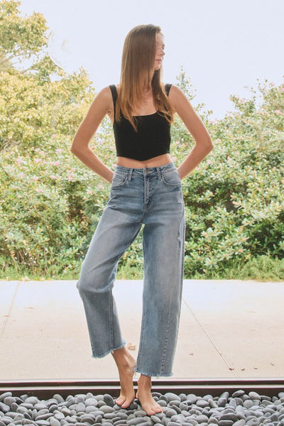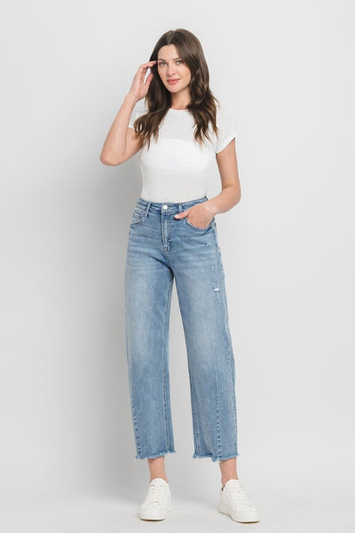 Super high rise barrel leg denim. Featuring comfort stretch, super high rise waist, slight distressed detail at the hem, cropped length and a barrel leg.