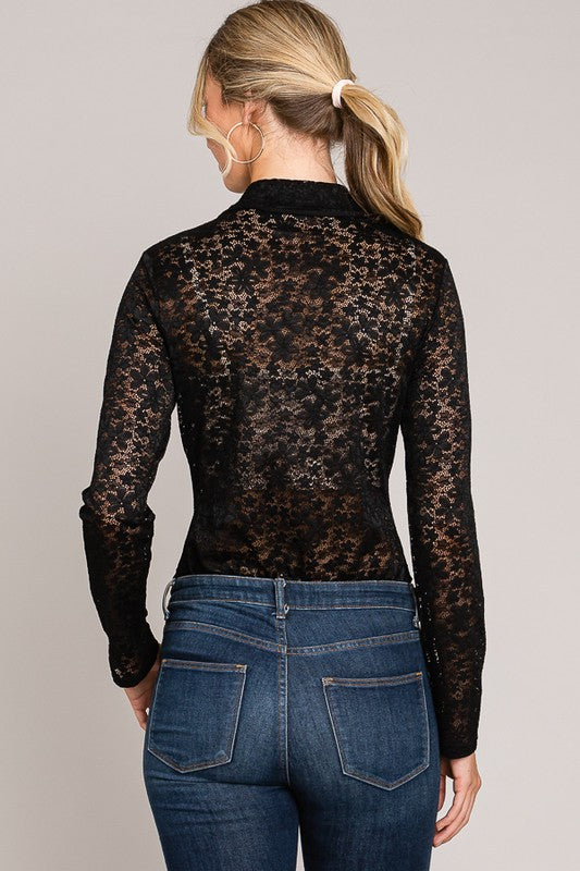 Floral lace dress shirt bodysuit. Fabric is stretchy for a super comfortable fit, and the bodysuit buttons are double tacked. Pair with your favorite denim or trouser this is a sure win!