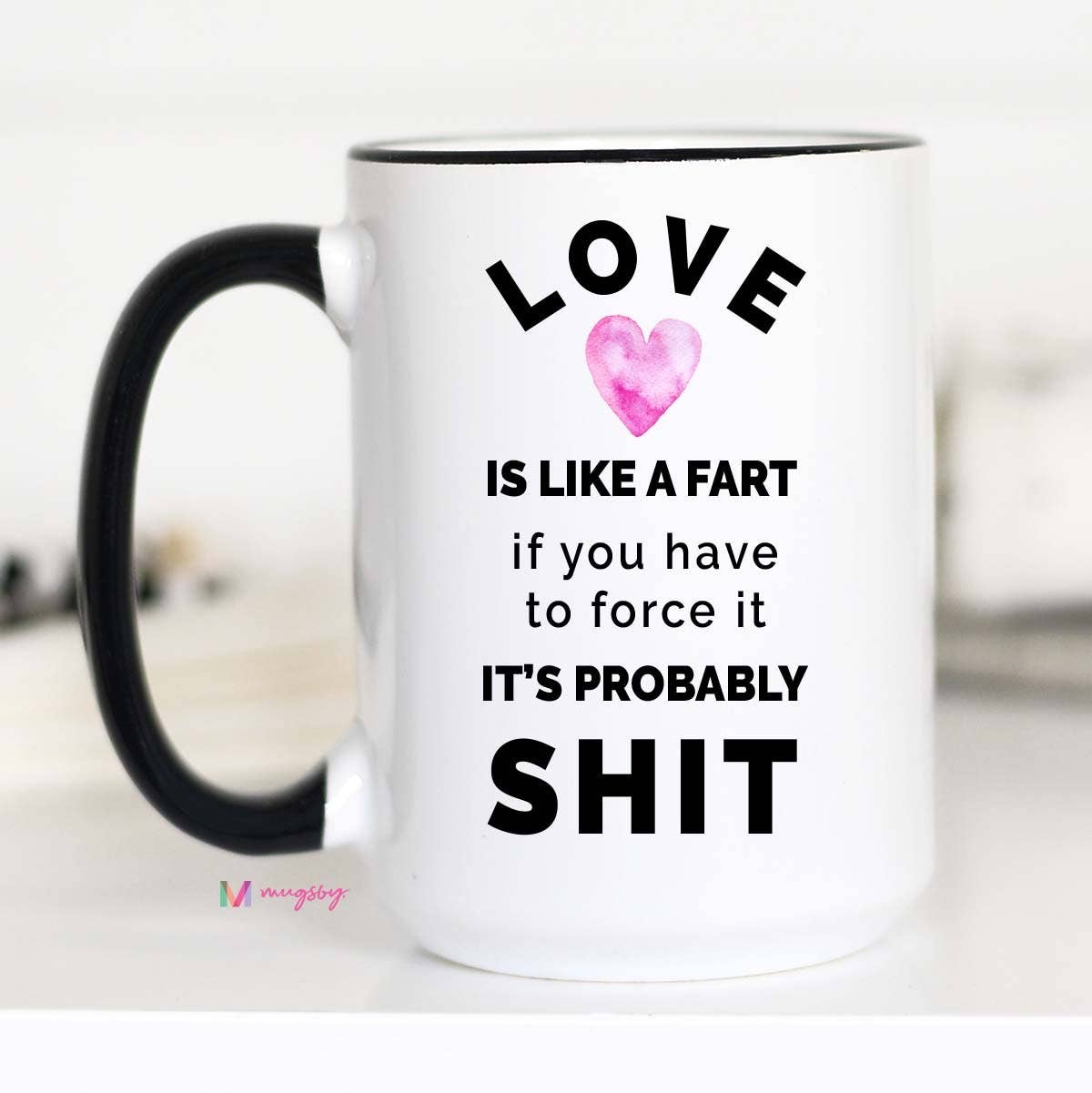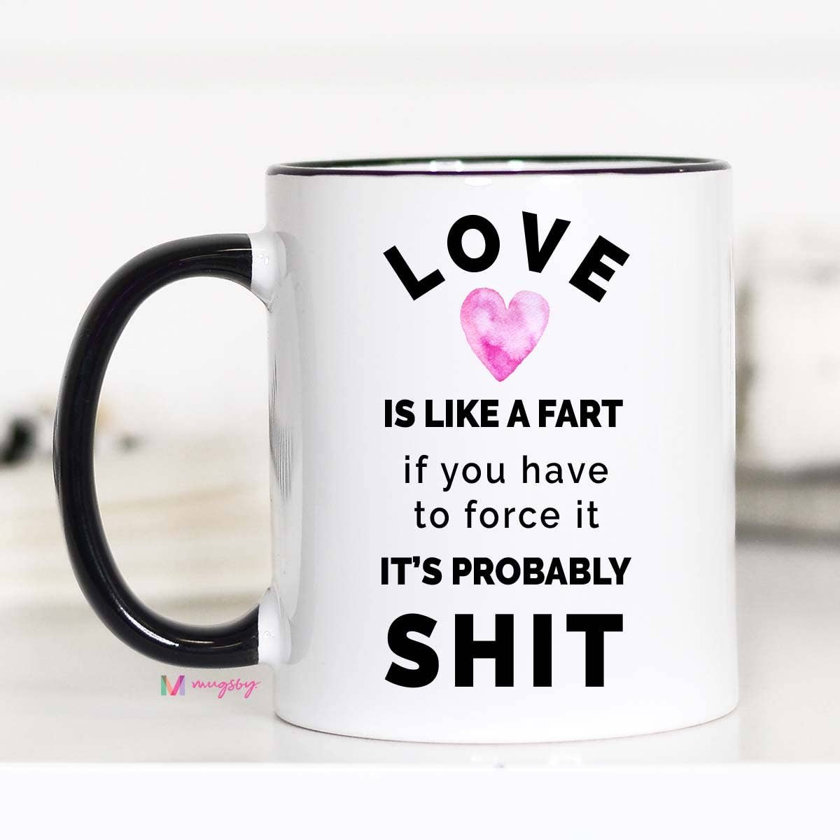 Double sided print. Top rack dishwasher safe. Microwave safe.. Off white with a black rim and handle. Made of ceramic.