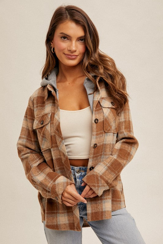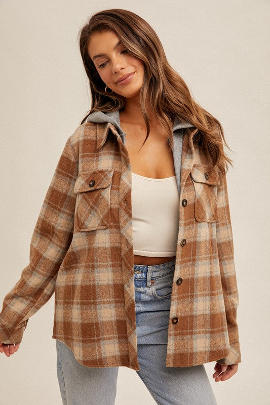 Button down plaid shacket with attached hoodie. Cute and cozy and the perfect layering piece or jacket.