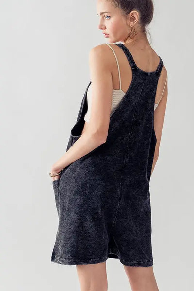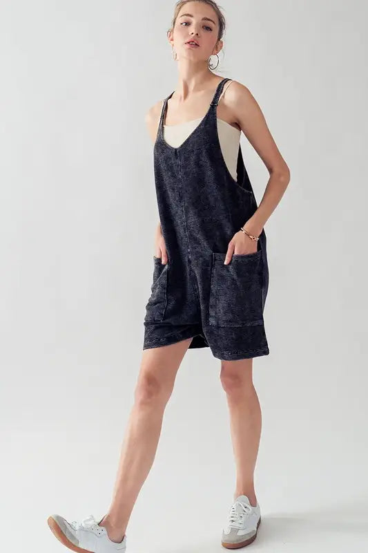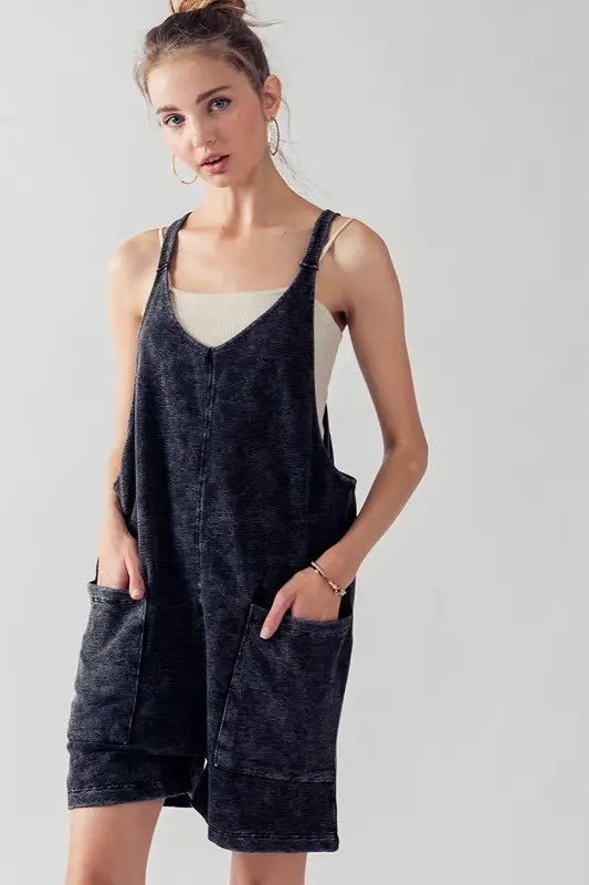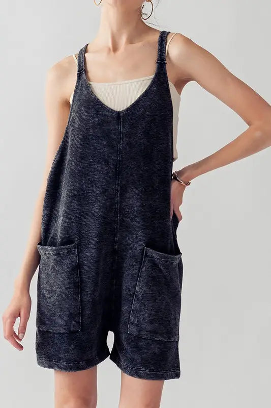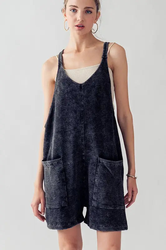 Sleeveless vintage wash scoop v neck line rib knit romper with front pockets.  Butter soft and extremely cozy for that on the go yet put together look!