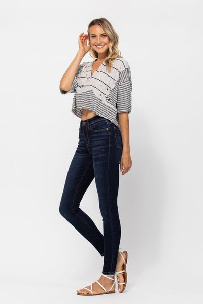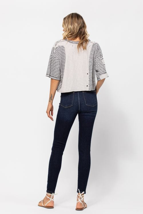 All of the feels with this high rise skinny denim. Hits at the ankle and offers enough stretch that we recommend sizing down one if not two sizes.