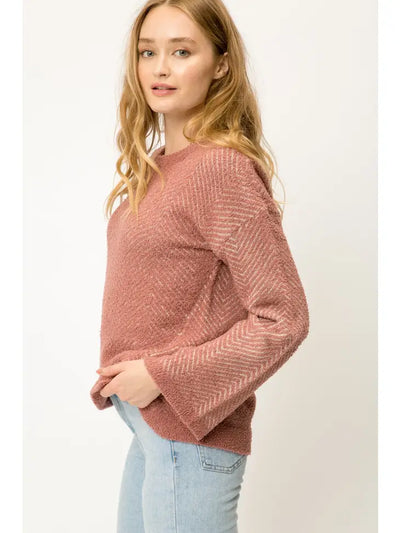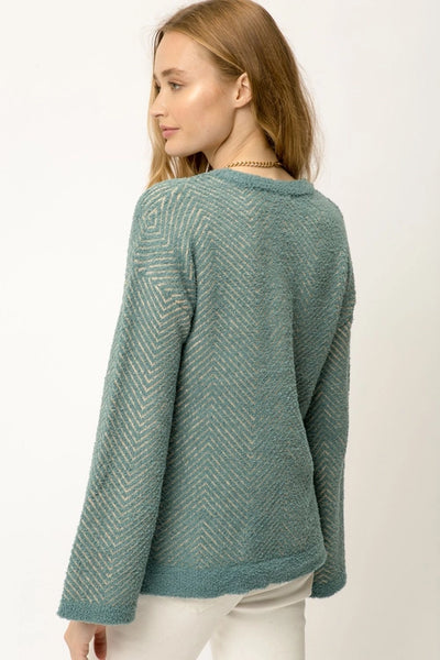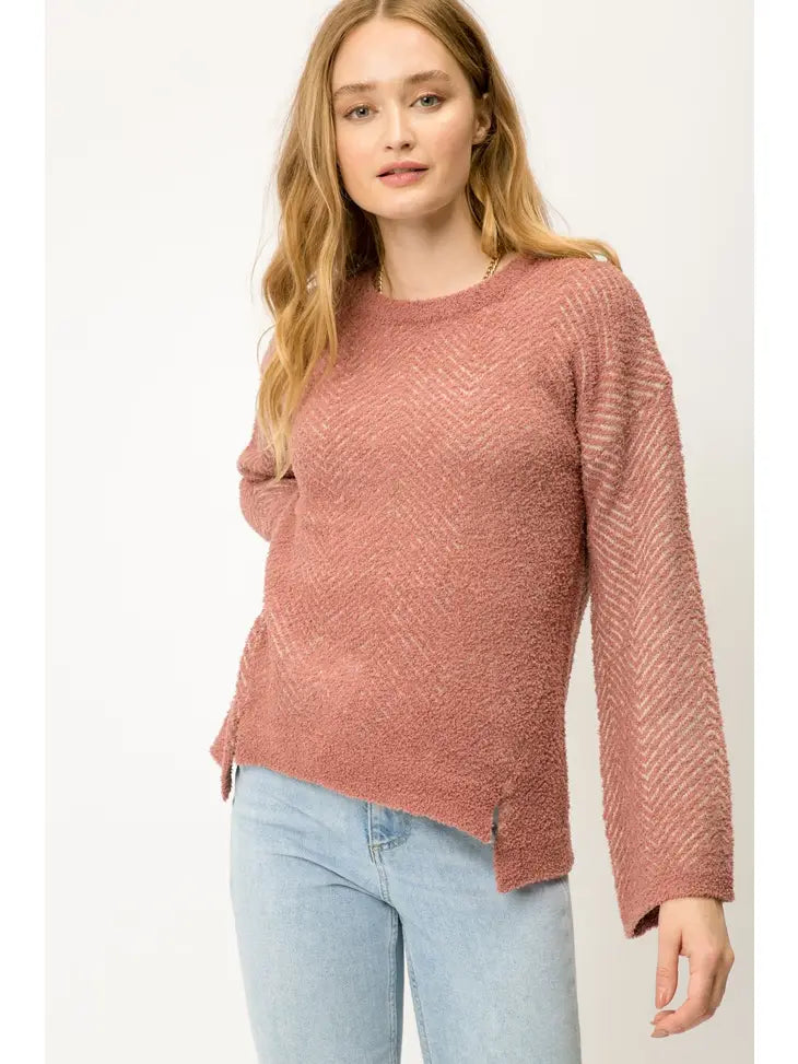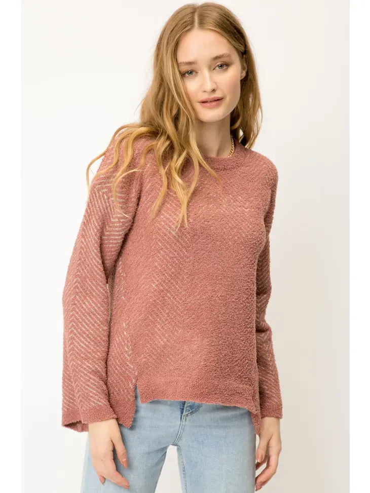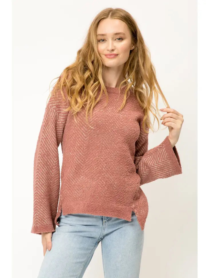 SUPER Soft chevron pullover with front slit!  Featuring a round neckline, bell sleeves, and hi low side slits.