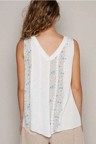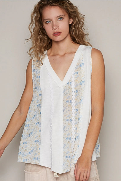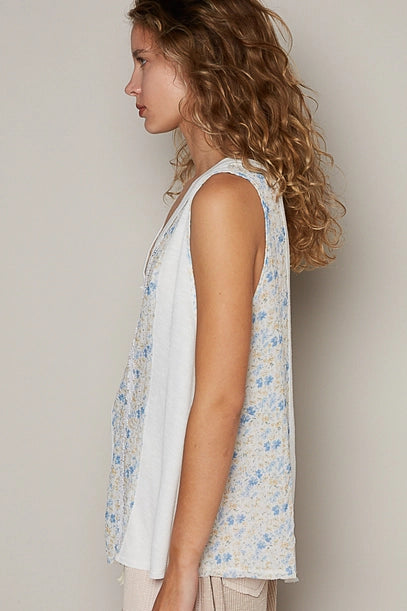 Designed in V-neck line oversized fit sleeveless knit top with rib and floral printed woven and trim, handkerchief hem. So cute and incredibly soft!
