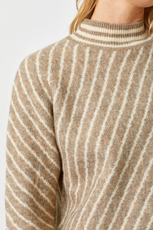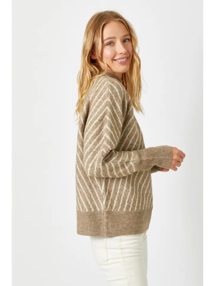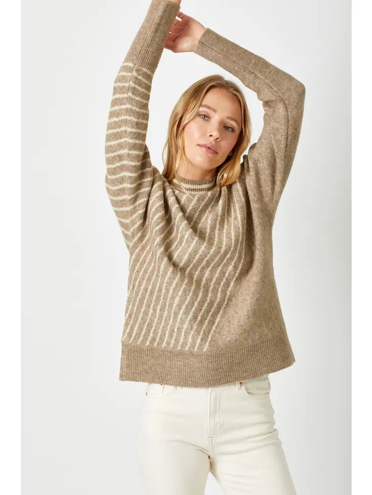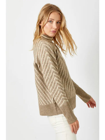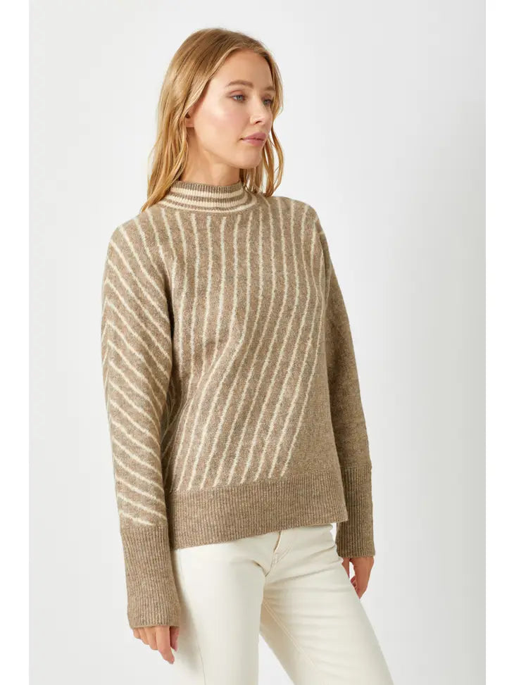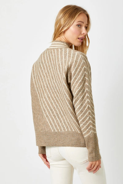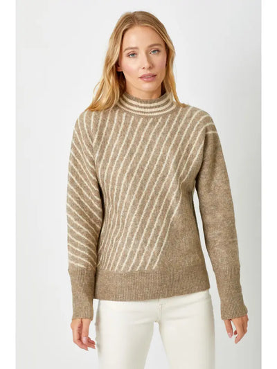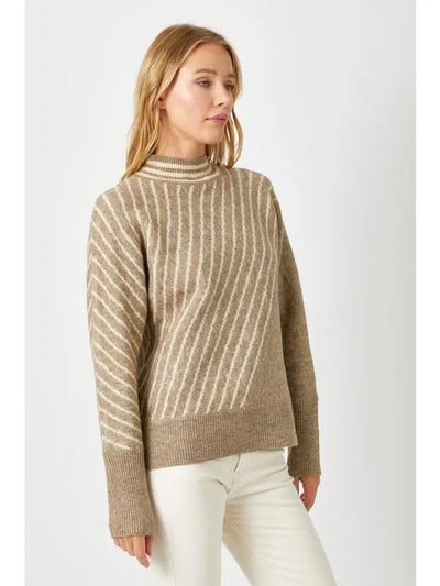 Ribbed stripe dolman sleeve sweater.  Featuring diagonal stripes in the middle and horizontal stripes on the mock neckline.  Super cozy and warm, and a looser fit.