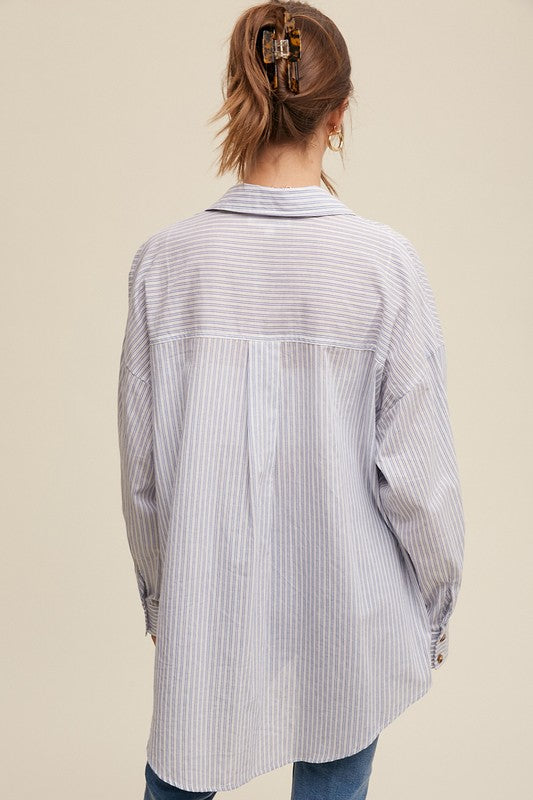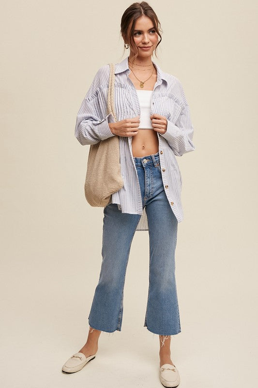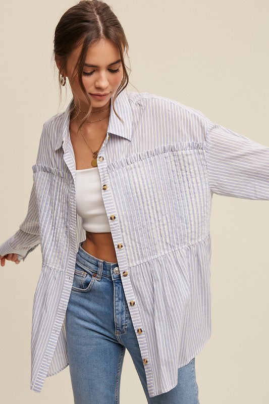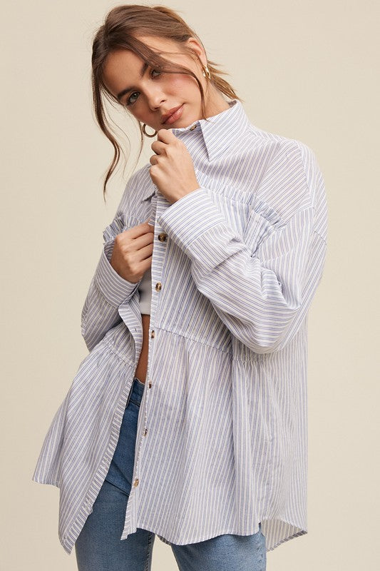 - Pinstripe button up shirts top with a collared neck, button cuffs, button down front and ruffle detailing on the chest. Unique and fun. Finished clean curved hem.