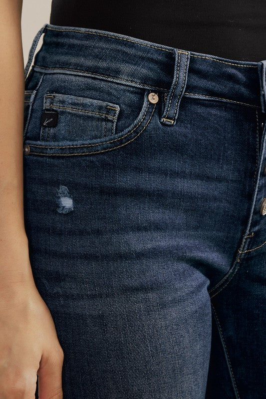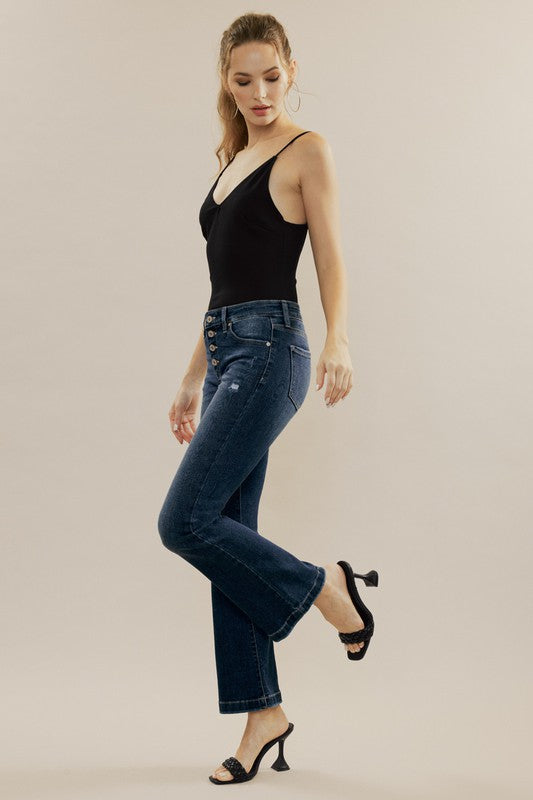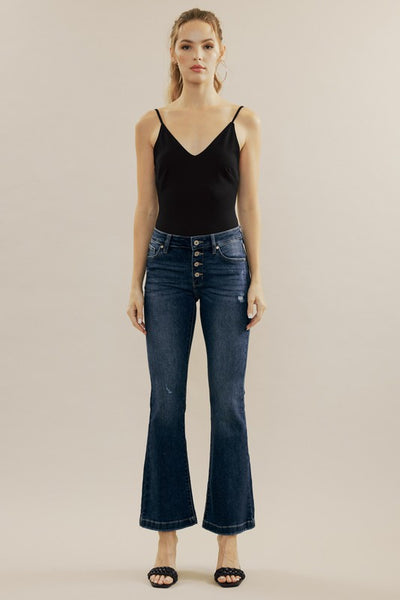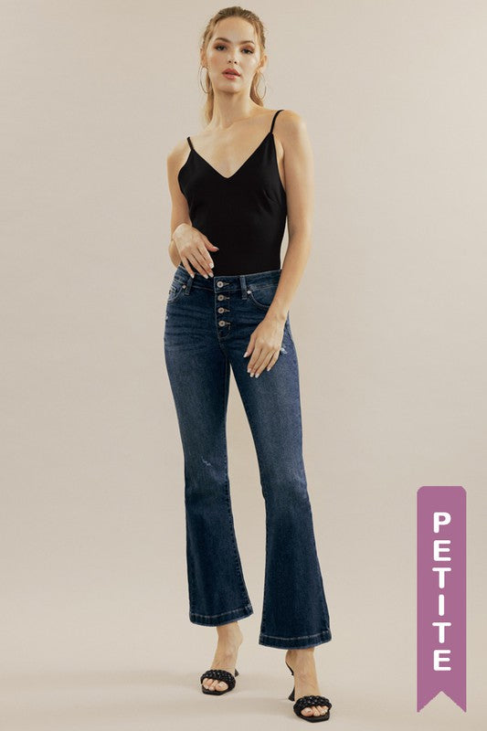 Petite Mid rise, yes PETITE, flare denim. These have the perfect amount of stretch and a button fly.