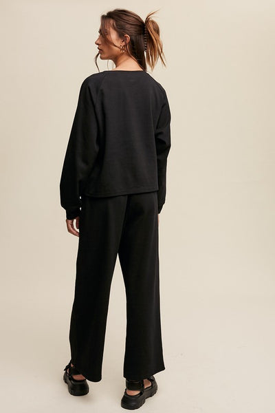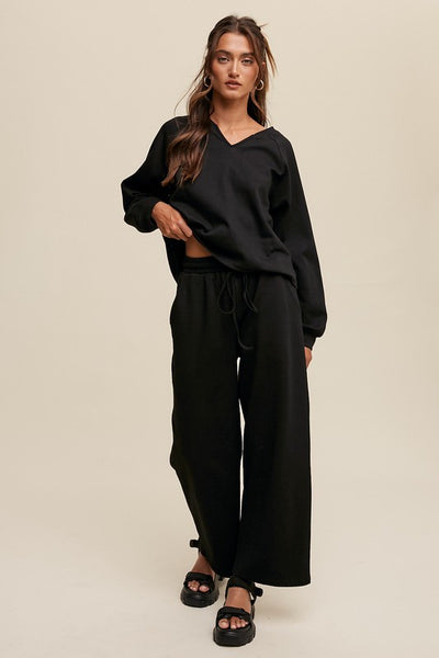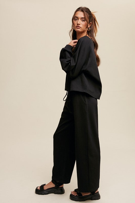 - Drawstring waist with tie string, stretched and seamed pockets. Finished with a clean hem.