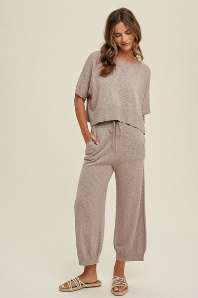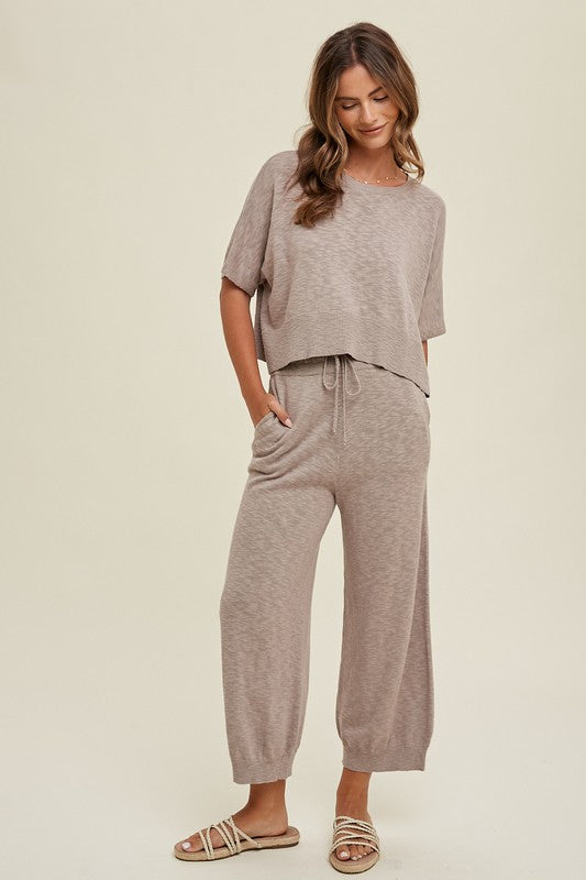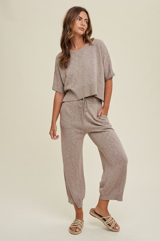 Two piece slub sweater set! This relaxed crop fit top with side slits paired with elastic waistband bottom (with drawstrings!), and side pockets is your favorite go to pair for a day out or simply to lounge around the house in!