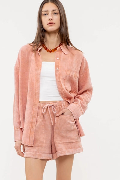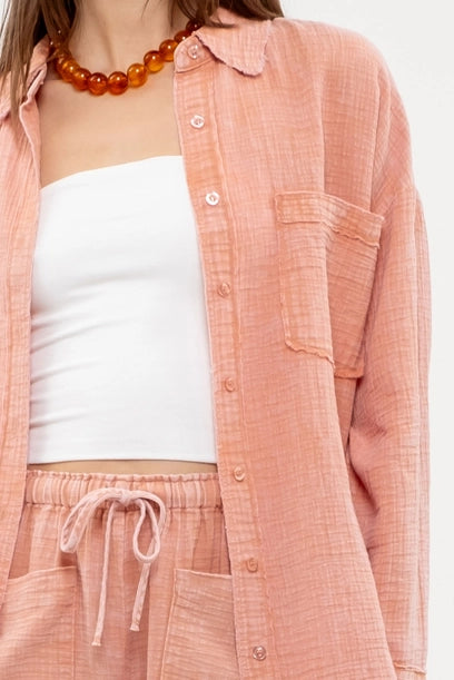 Collared button down with long sleeves and button cuff.  Raw edge hem for a fun look. Gauze material for complete comfort!